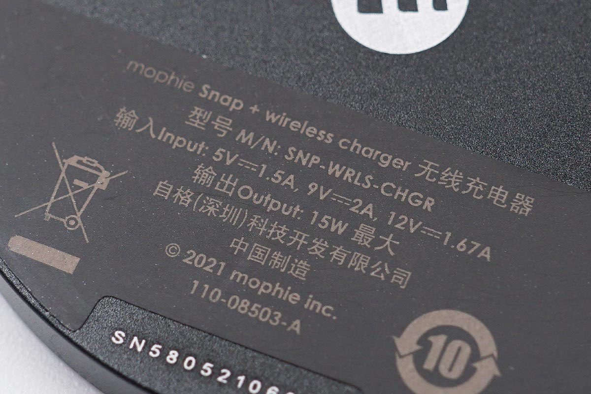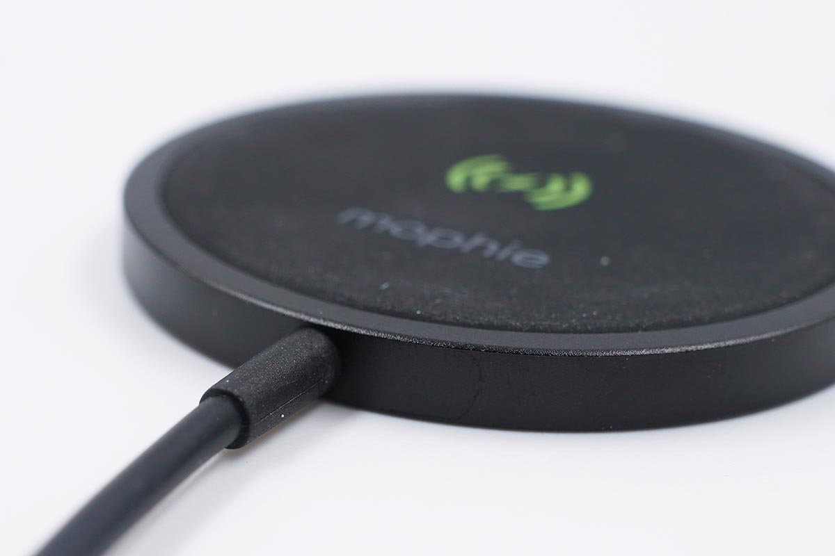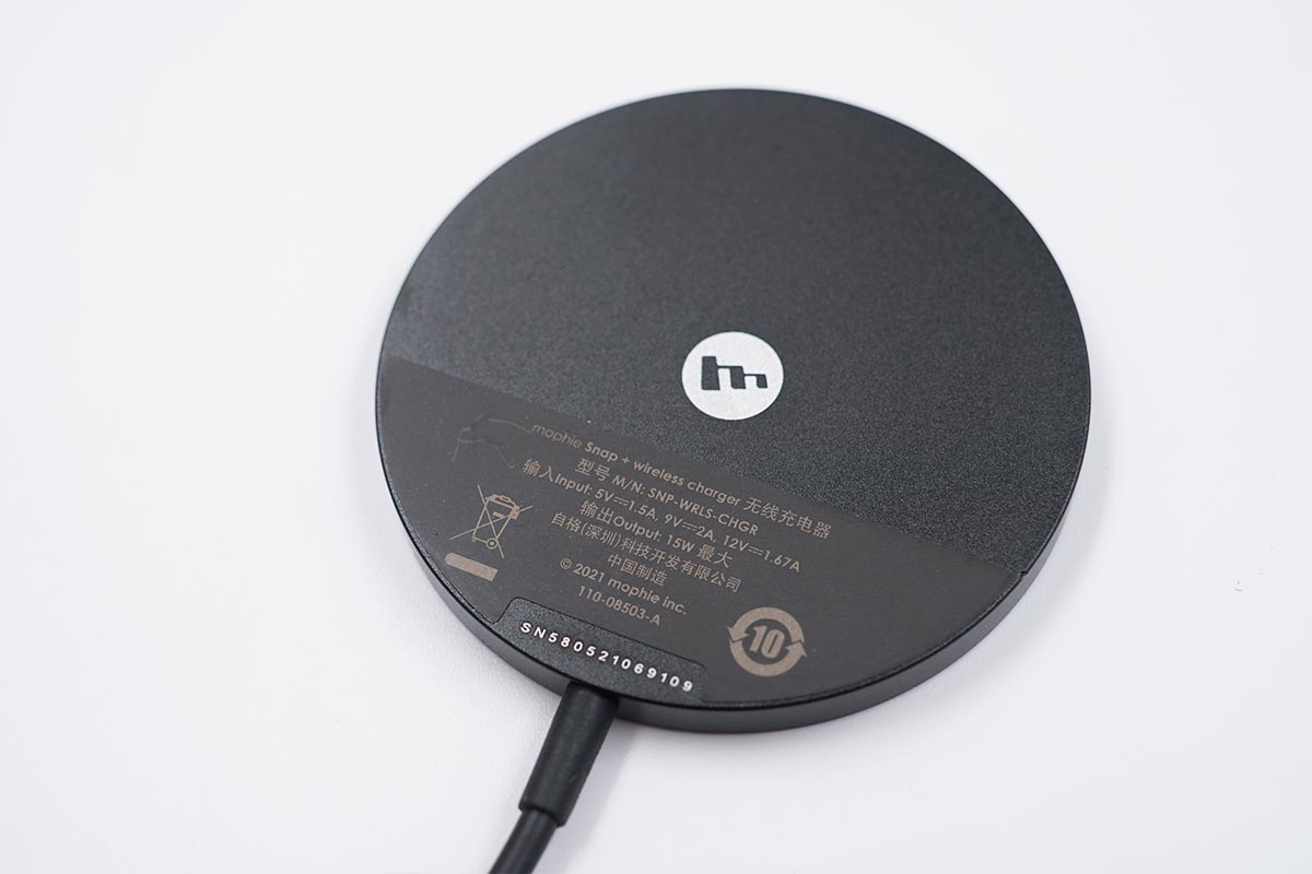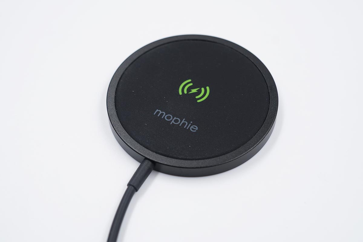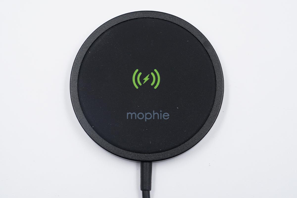 mophie磁吸無線充電器的充電面板整體外觀為黑色,外圈為鋁材質,內部無線充電區域使用硅膠填充,中間可以看到無線充電的標識和mophie的品牌Logo。