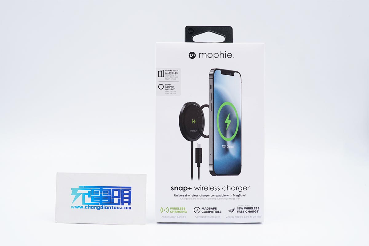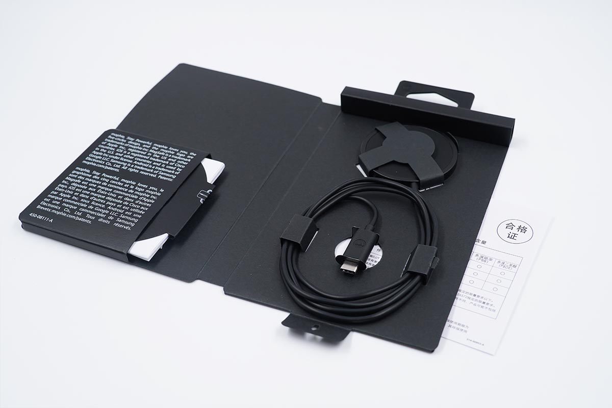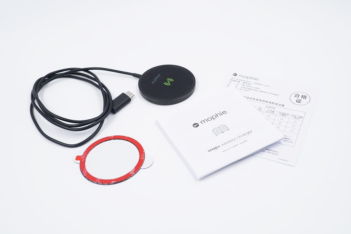 包裝盒內的產品包括mophie磁吸無線充電器,磁鐵以及紙質配件。