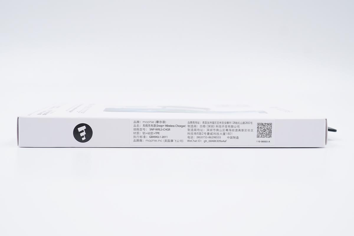 mophie MagSafe磁吸無線充電器包裝盒的正面可以看出這款產品的使用操作,包裝盒頂部帶有掛鉤方便上架,下方是這款產品的名稱:snap+ wireless charger 。