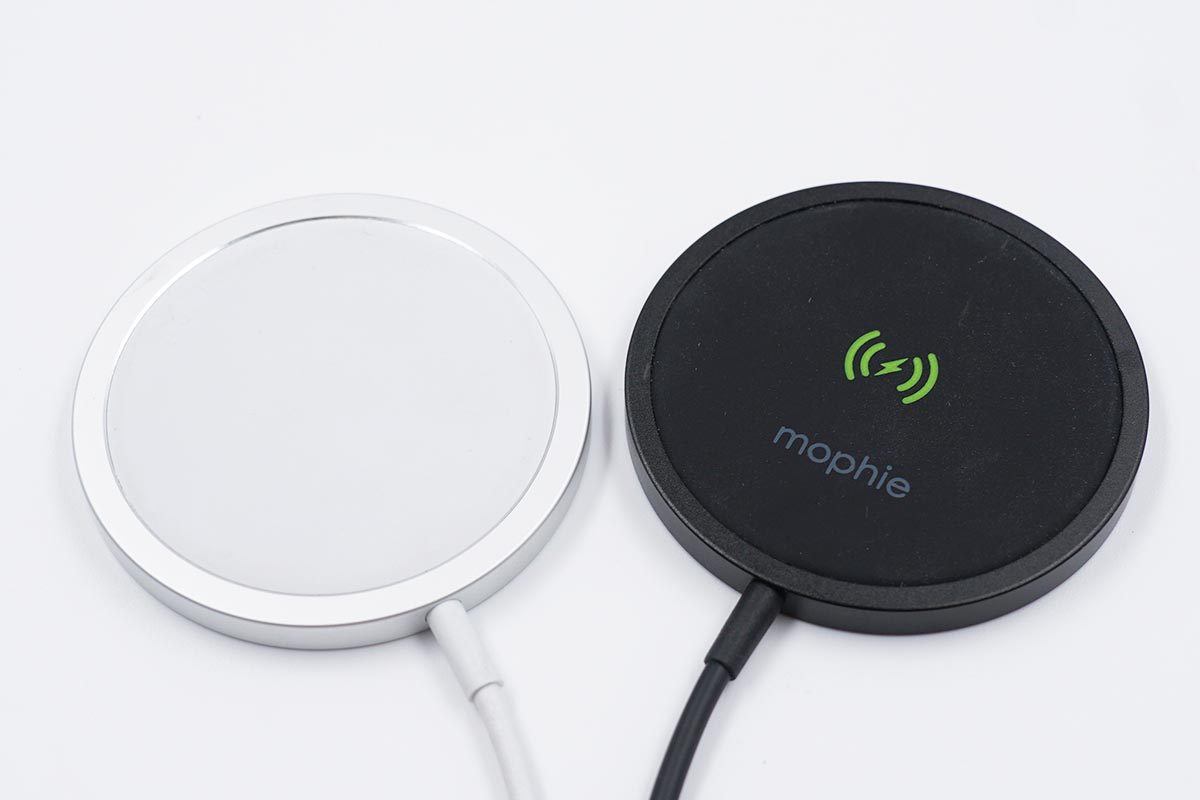 筆者將兩款磁吸無線充電器放在一起,兩款充電器在外觀上采用一黑一白兩種風格,而mophie的充電面板上的圖案要更豐富一些。