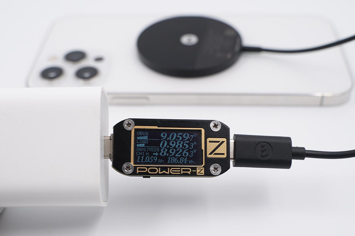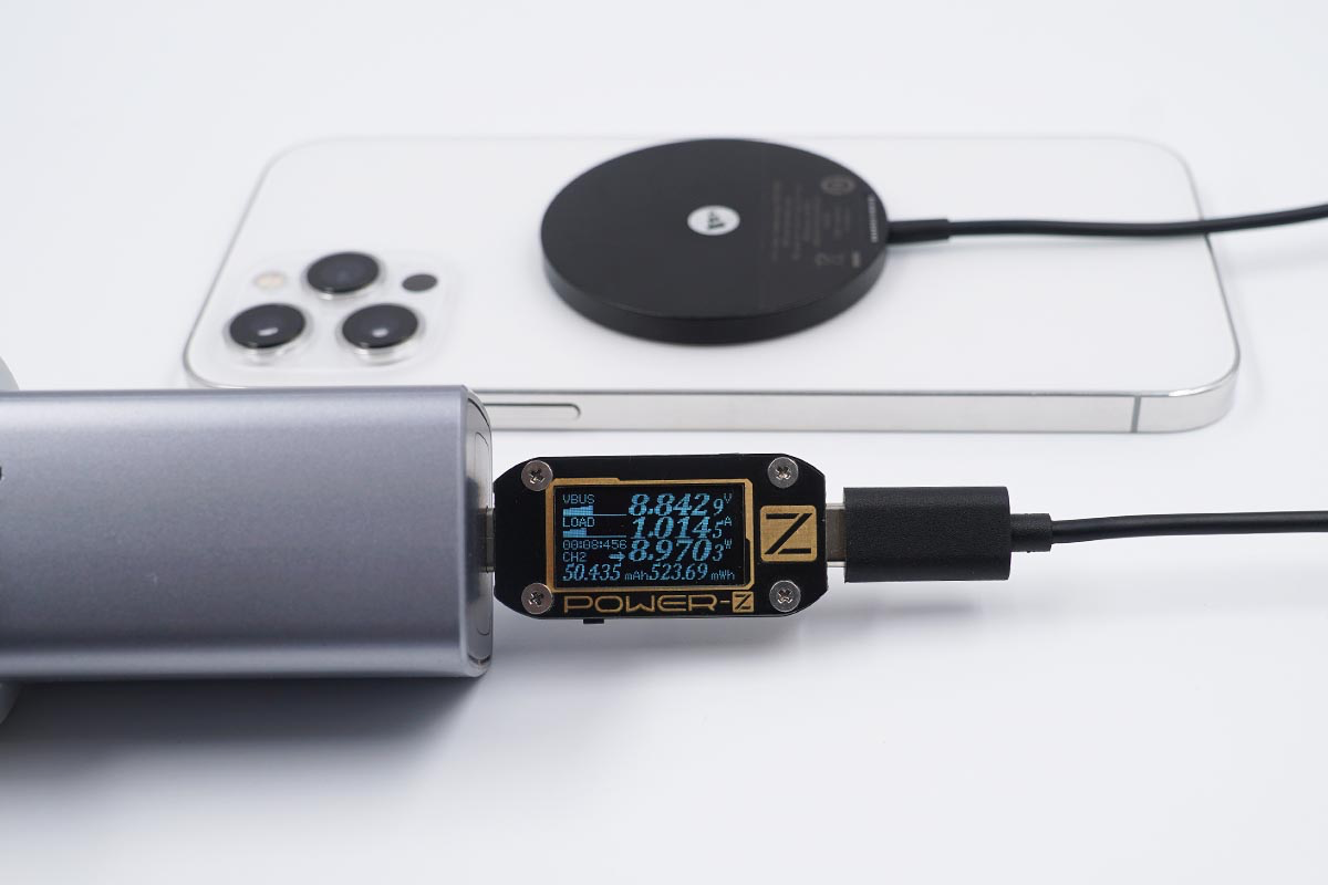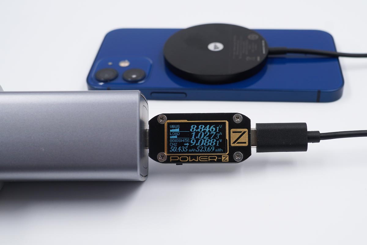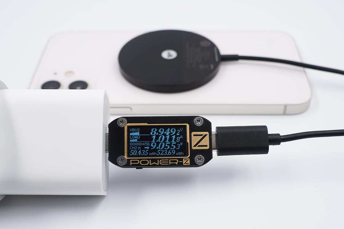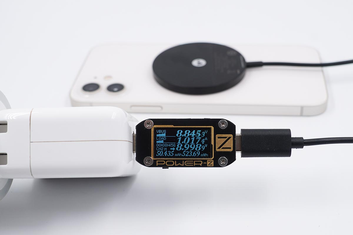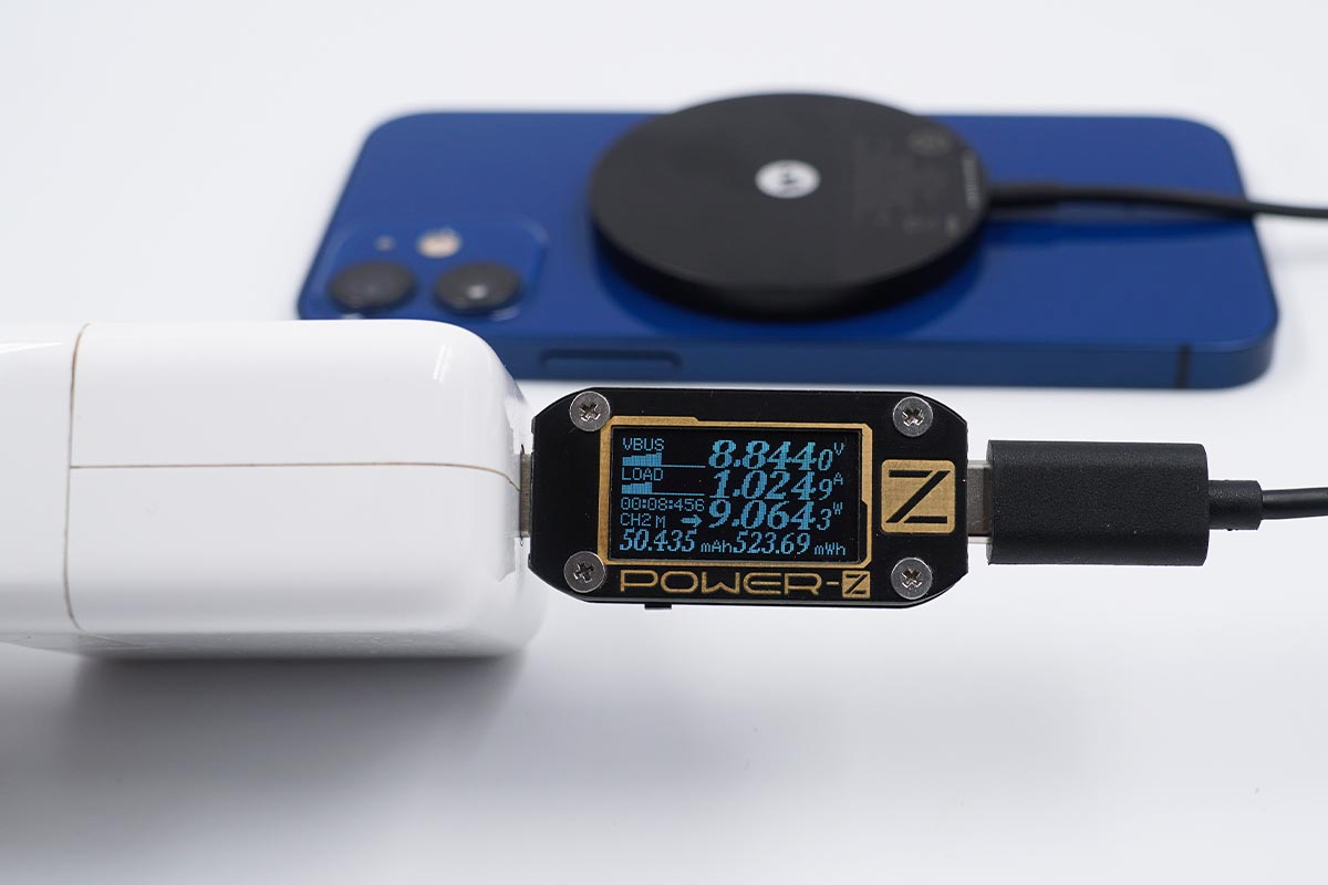 使用努比亞65W氘鋒氮化鎵充電器搭配mophie MagSafe磁吸無線充電器為iPhone 12 mini充電,采集到輸入端功率為9.08W。
