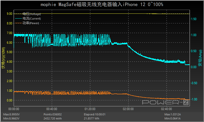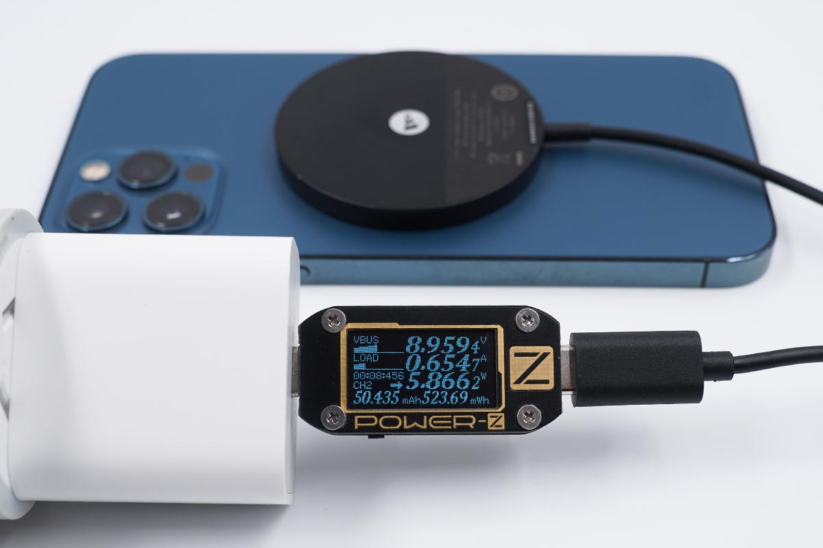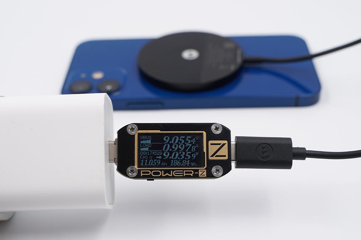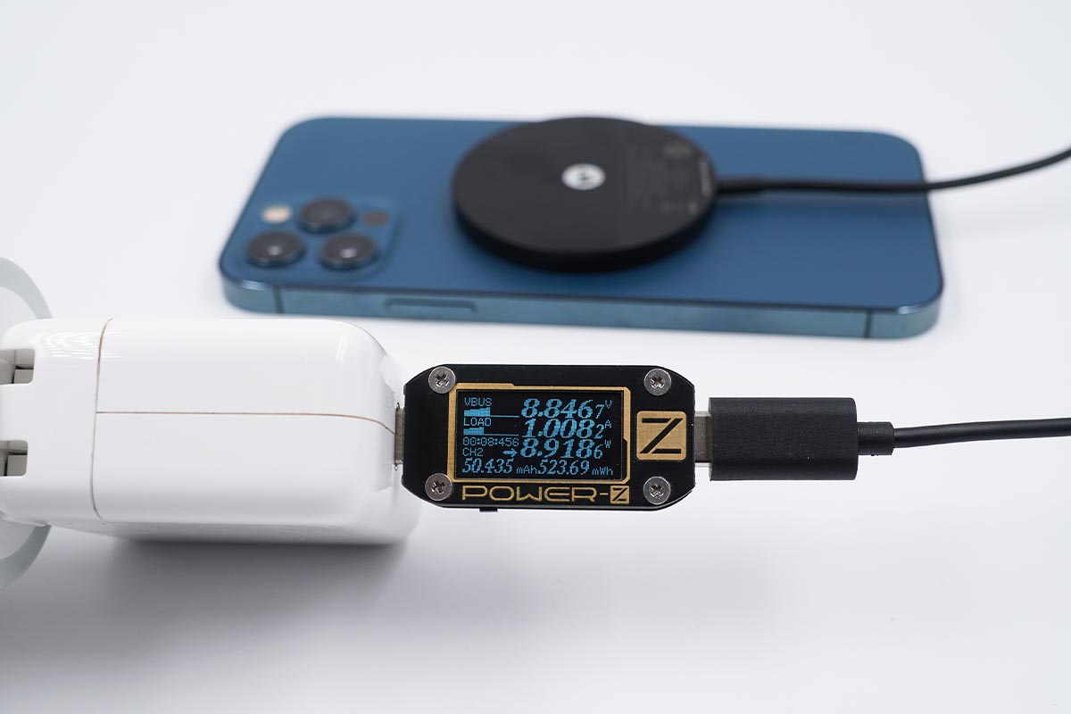 因為mophie磁吸無線充電器帶有磁吸效果,所以可以完美適配iPhone 12的MagSafe無線充電,使用蘋果20W充電器搭配mophie MagSafe磁吸無線充電器為iPhone 12充電,采集到輸入端功率為9.05W。