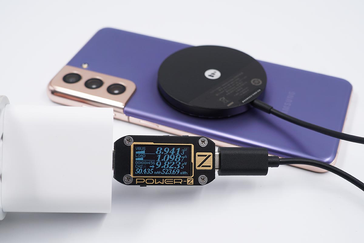 使用蘋果20W充電器搭配mophie MagSafe磁吸無線充電器為三星S21充電,采集到輸入端功率為9.82W。