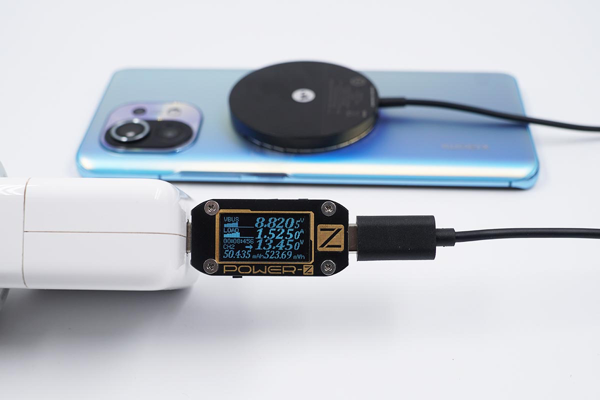 使用蘋果30W充電器搭配mophie MagSafe磁吸無線充電器為小米11充電,采集到輸入端功率為13.45W。