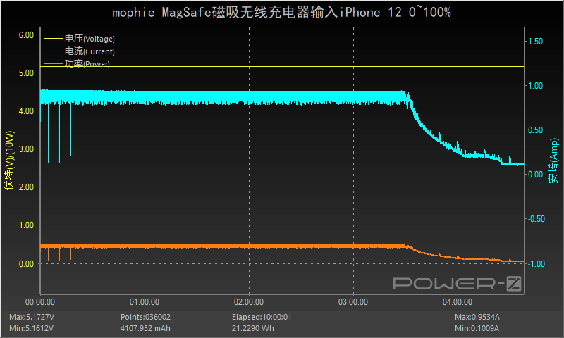 筆者使用蘋果20W充電器搭配mophie MagSafe磁吸無線充電器為iPhone 12充電,功率持續以5W左右為iPhone 12充電,3小時30分后功率和電流逐漸下降直至充電結束,全程耗時約4小時24分,最高功率為5.16V 0.93A 4.84W。