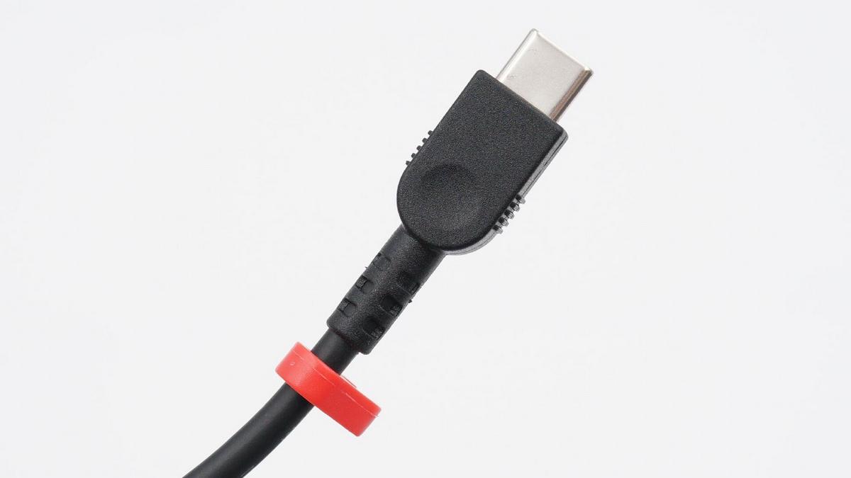 USB-C線頭塑料殼上設有凹面和小凸齒,此外設有紅色的塑料鎖扣,方便插拔和整理設計。