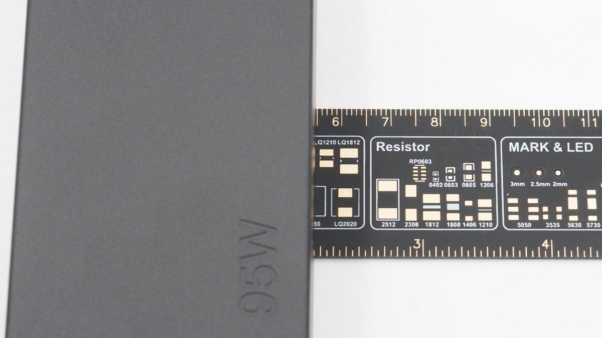 充電器機身采用直板造型,不過兩端為弧面設計,機身殼表面磨砂處理,其中正面一角凹印95W字樣。