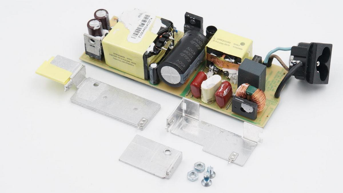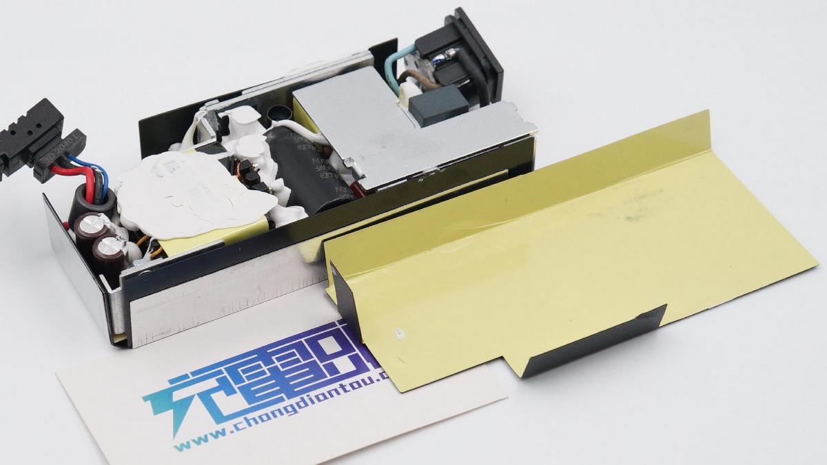 頂部散熱片貼合PFC升壓電感,兩側散熱片則貼合整流橋、初級開關MOS管和同步整流管,均是主要發熱器件。
