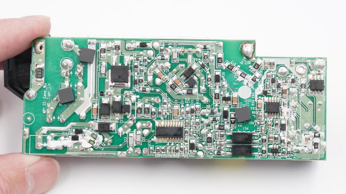PCB板背面一覽,初次級之間橫跨兩顆光耦,初級側設有組合控制器和PFC升壓開關管,次級側設有同步整流控制器、協議IC和輸出VBUS開關管。