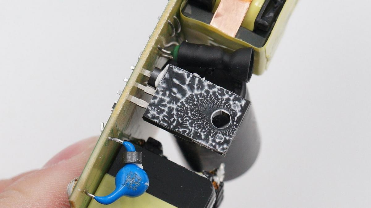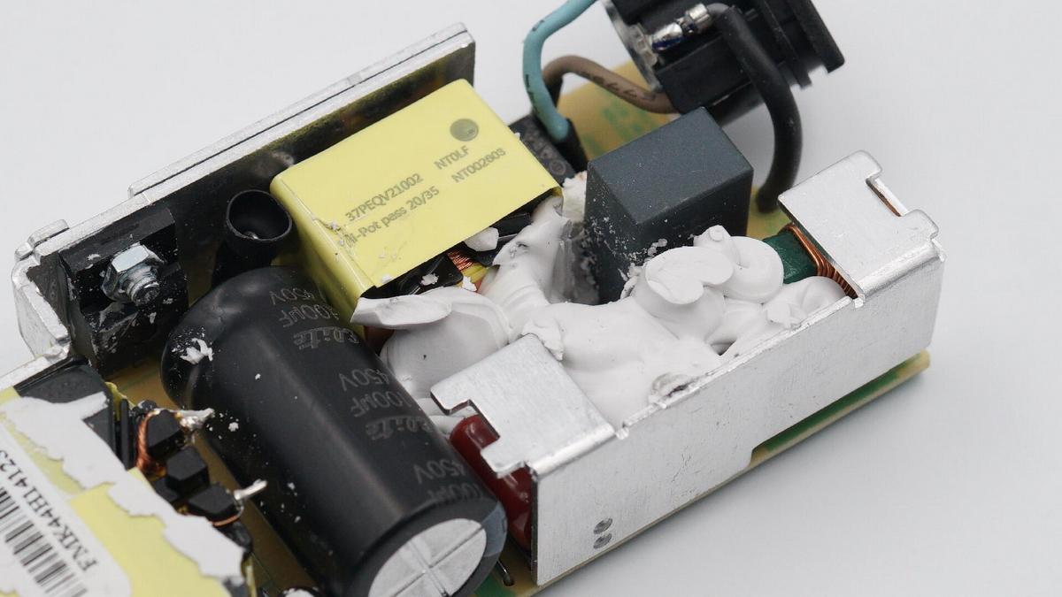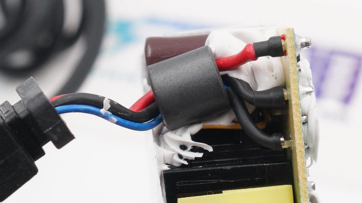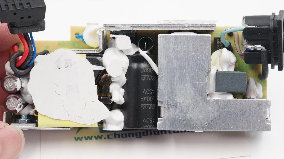 另外充電器內部元器件分布稀疏,間隙間填充硅膠加固和導熱,主要發熱器件配有專門散熱片,外圍覆蓋大面積鋁片,輸入輸出導線絕緣處理,細節也很講究。
