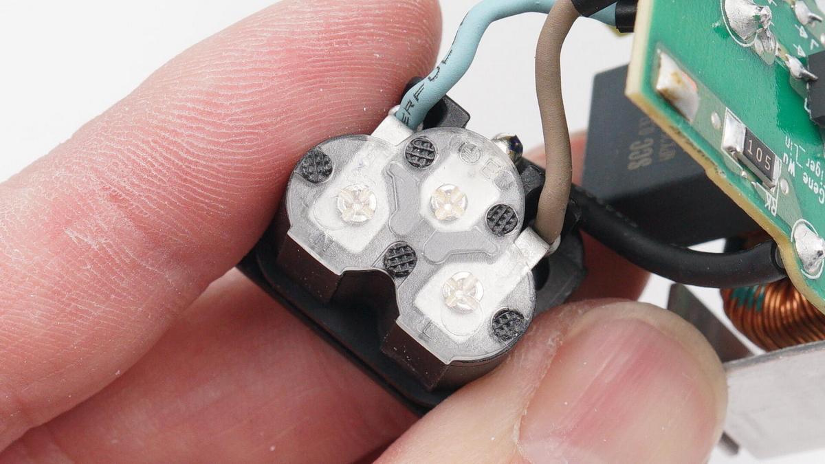 輸入端塑料母座特寫,導線軋緊,并和母座上的金屬片錫焊。