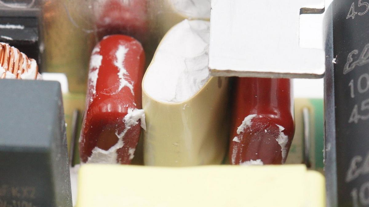 右側則有兩顆紅色薄膜電容以及濾波電感,電感包裹絕緣膠帶。