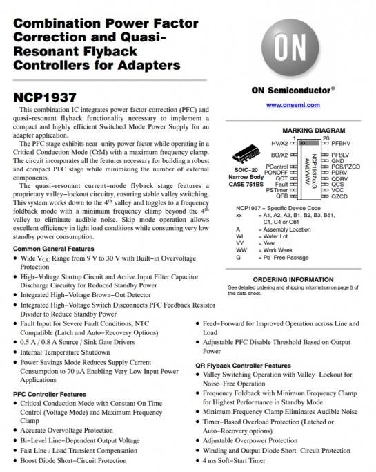 安森美NCP1937組合控制器,集成了功率因數校正(PFC)控制器及準諧振(QR)反激控制器,用于緊湊高效率開關電源適配器。
