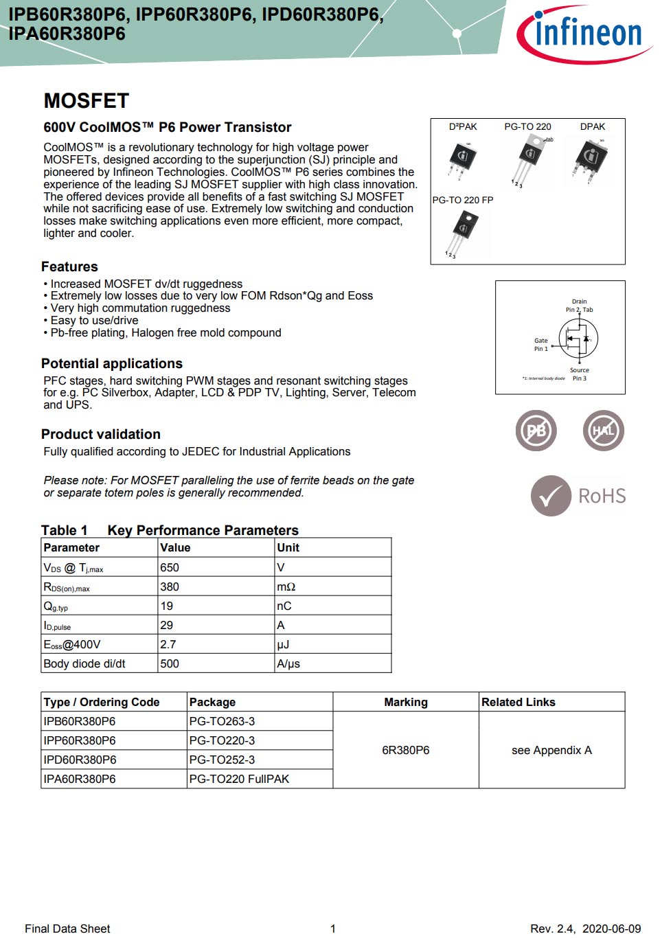 英飛凌 IPD60R380P6 詳細資料。