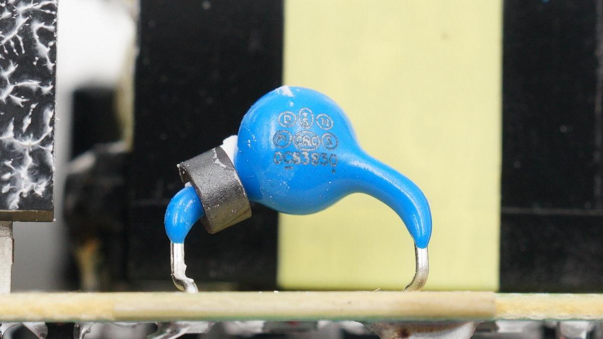藍色Y電容特寫,引腳套有磁珠。
