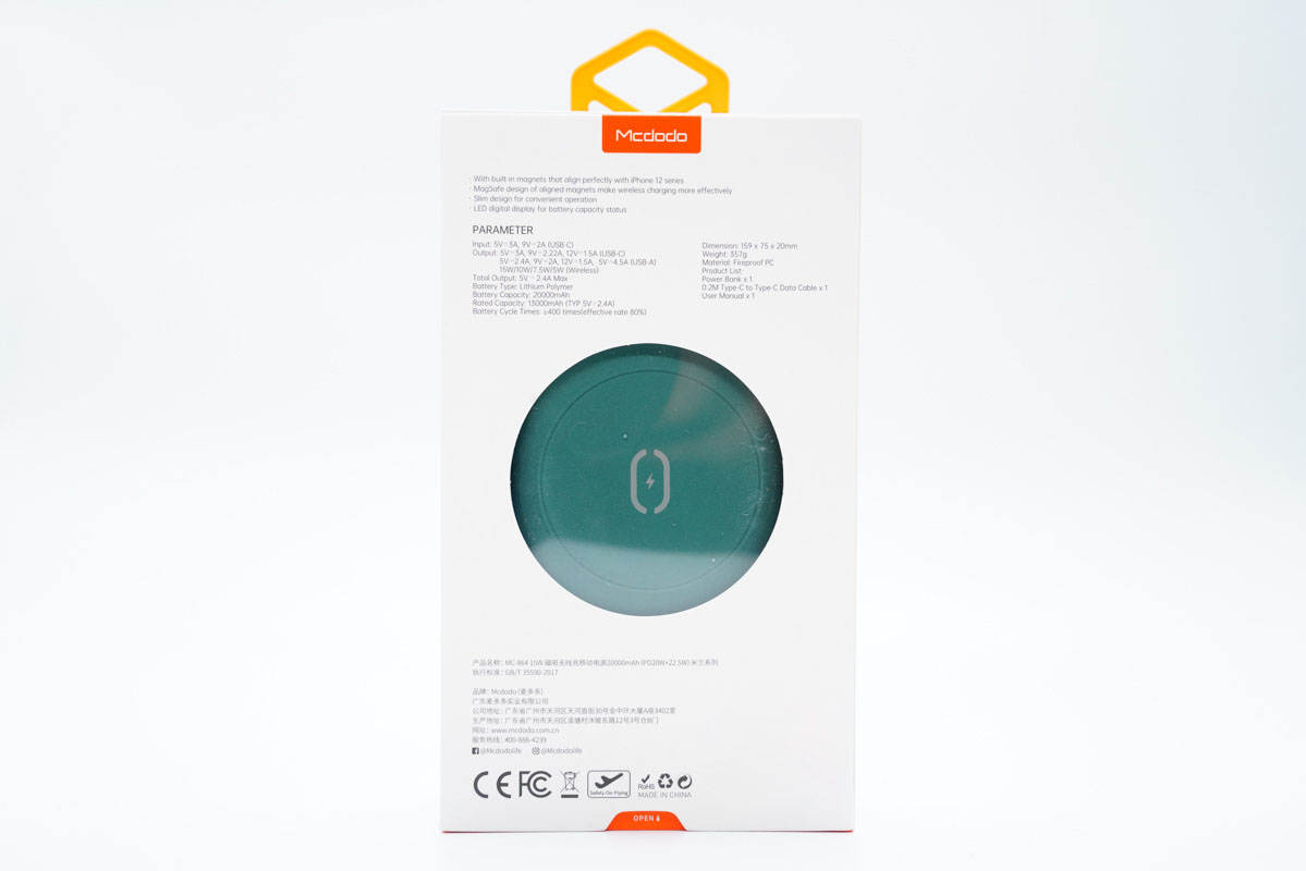 背面設(shè)有櫥窗,正好對(duì)應(yīng)產(chǎn)品無(wú)線充區(qū)域,此外盒子上印有參數(shù)和認(rèn)證信息。