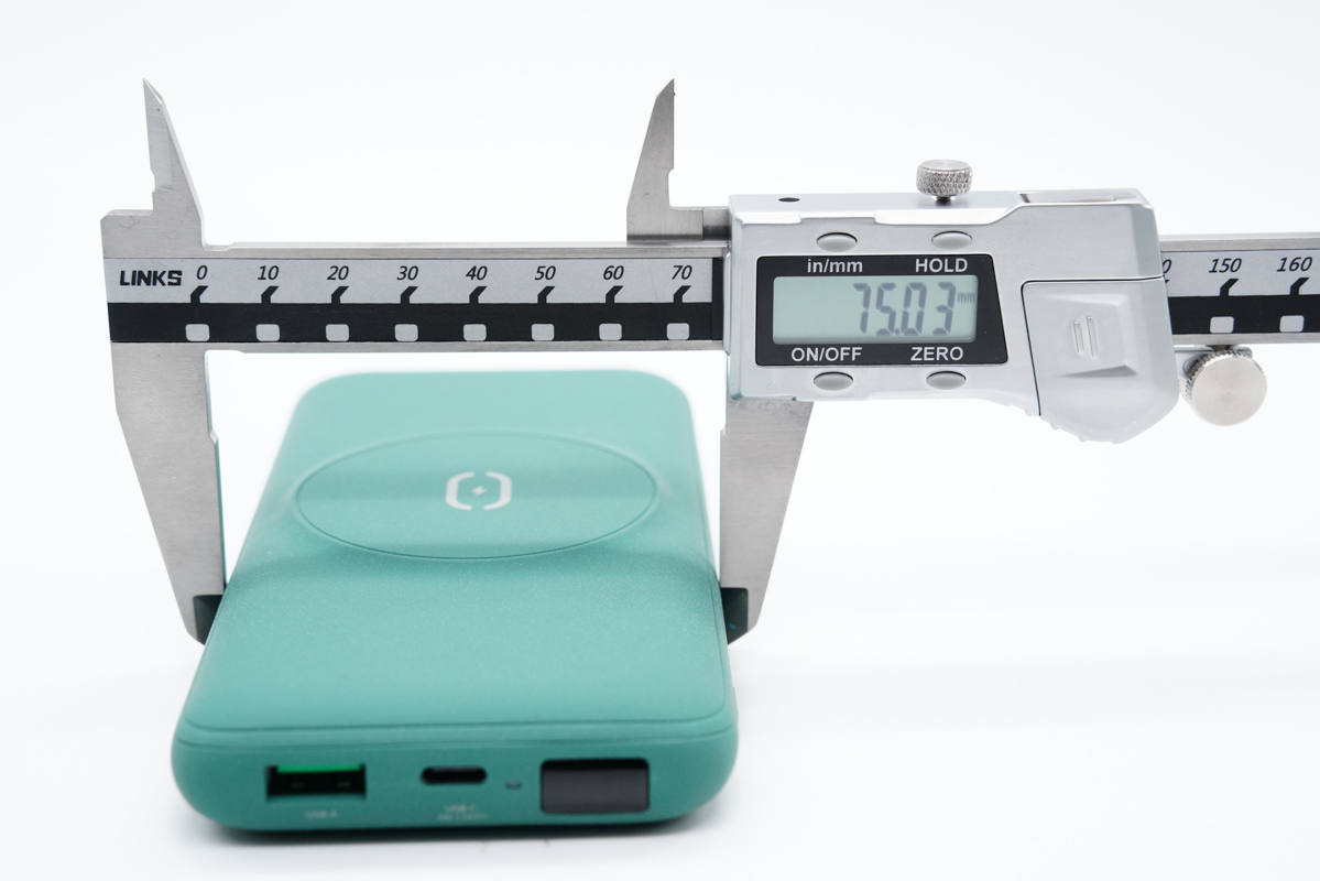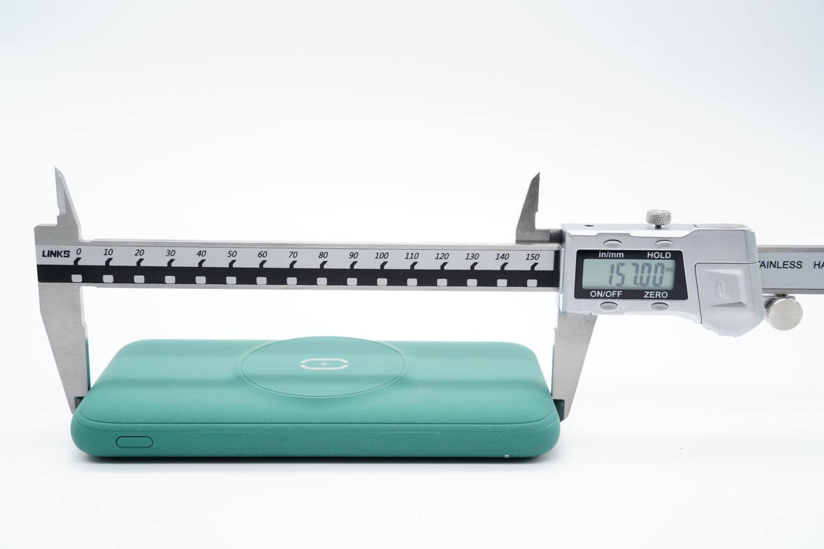 使用游標(biāo)卡尺實(shí)測(cè)移動(dòng)電源機(jī)身長(zhǎng)157mm。