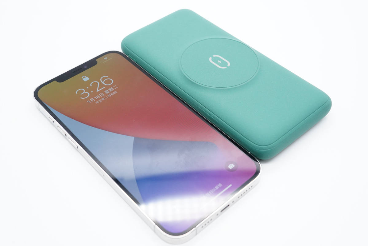 和iPhone 12 Pro Max直觀對(duì)比,移動(dòng)電源稍小一圈。