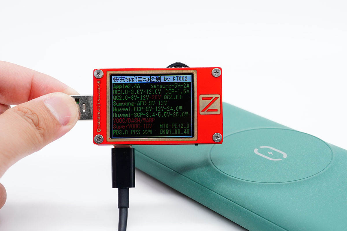 使用ChargerLAB Power-Z KT002讀取USB-A口輸出協(xié)議,顯示支持Apple2.4A、Samsung 5V2A和DCP協(xié)議,以及QC2.0/3.0、AFC、FCP、SCP、PE2.0多個(gè)快充協(xié)議。