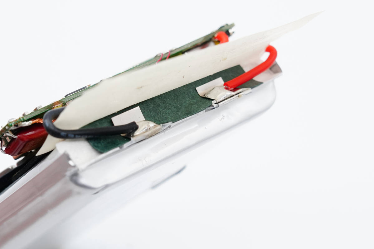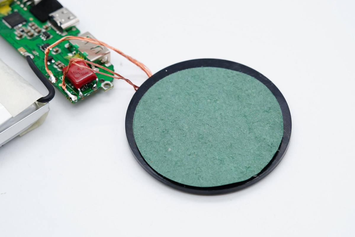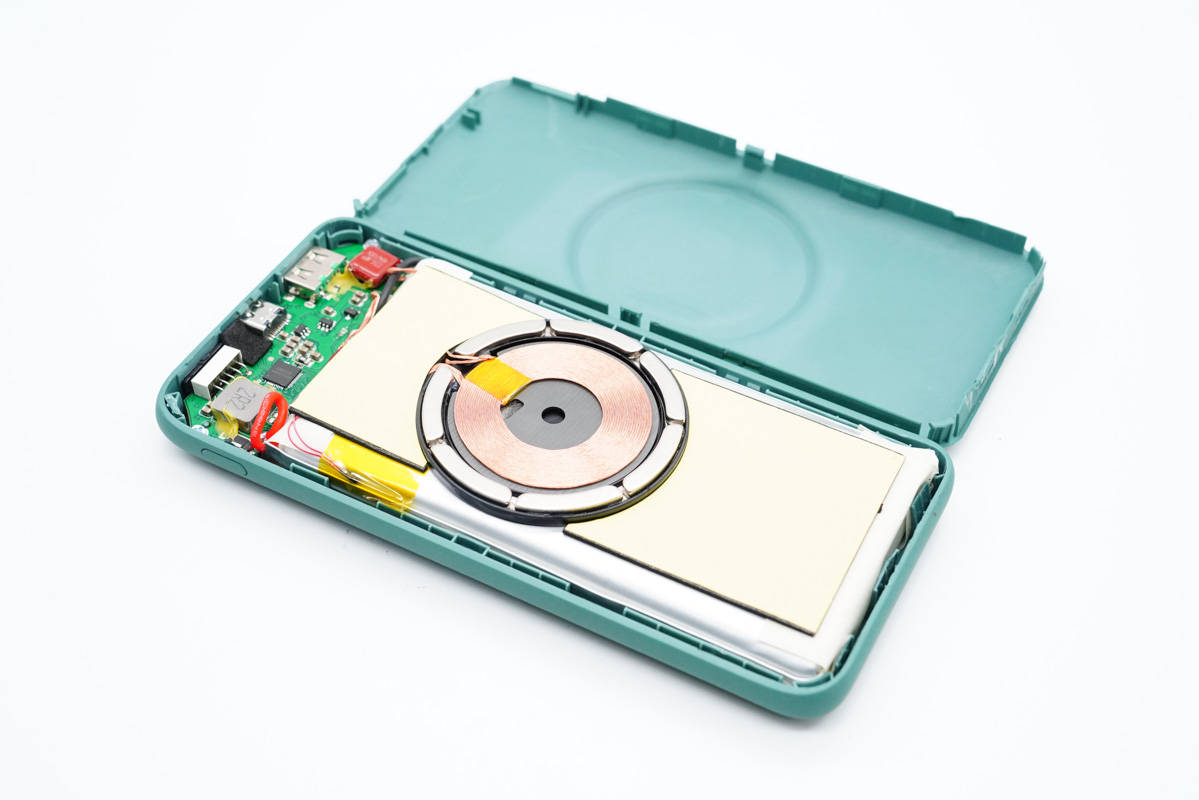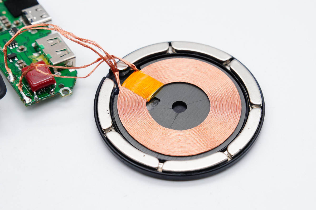 無(wú)線充電線圈放置在電芯上,兩者之間有泡棉墊著進(jìn)行隔離,線圈外圍一圈磁鐵。