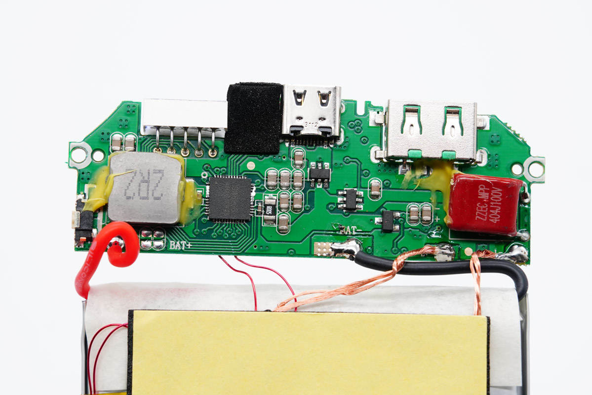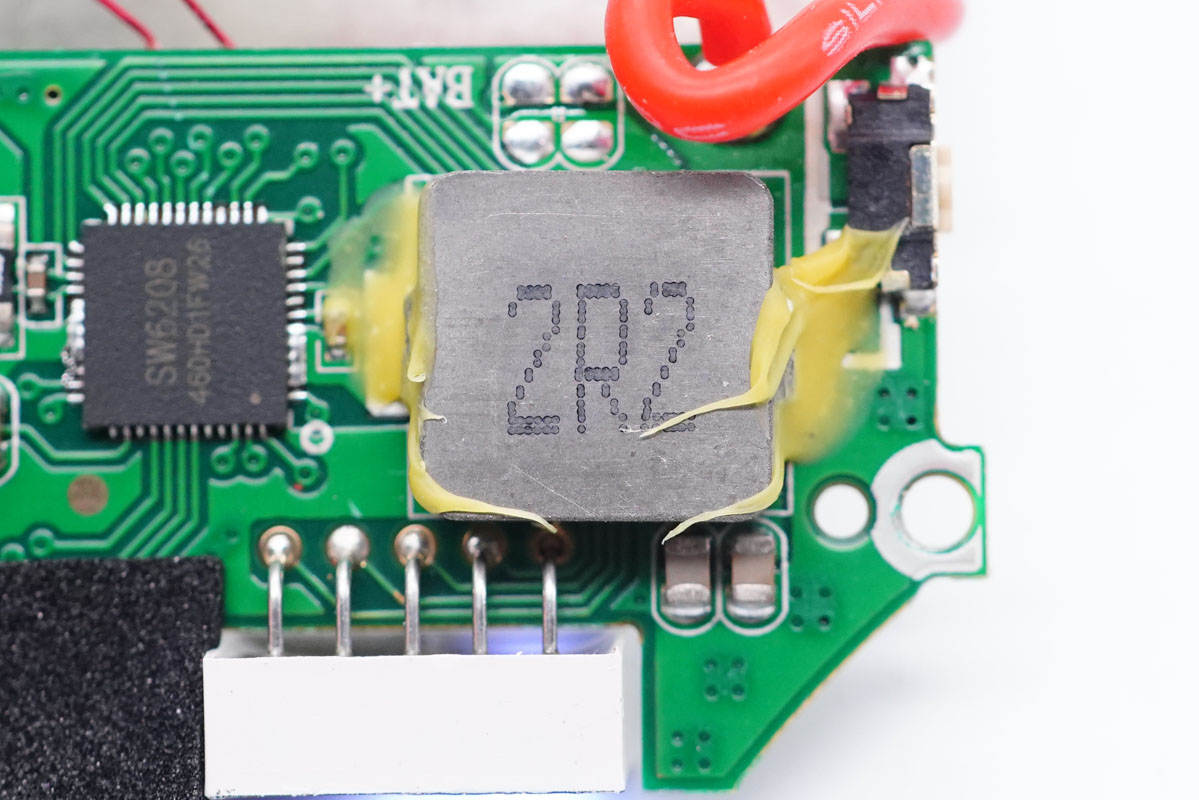 2R2電感特寫(xiě),配合主控芯片進(jìn)行升降壓實(shí)現(xiàn)移動(dòng)電源充放電。