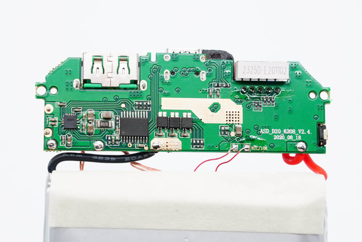 經(jīng)過(guò)對(duì)PCB板正背面電路觀察發(fā)現(xiàn),麥多多20000mAh磁吸無(wú)線充移動(dòng)電源采用一顆主控芯片進(jìn)行升/降壓轉(zhuǎn)換實(shí)現(xiàn)1A1C雙口任一口快充輸入/輸出;另外采用無(wú)線充電主控芯片加一體化驅(qū)動(dòng)器控制無(wú)線充輸出。下面我們從電芯放電到三路輸出來(lái)了解各元器件信息。