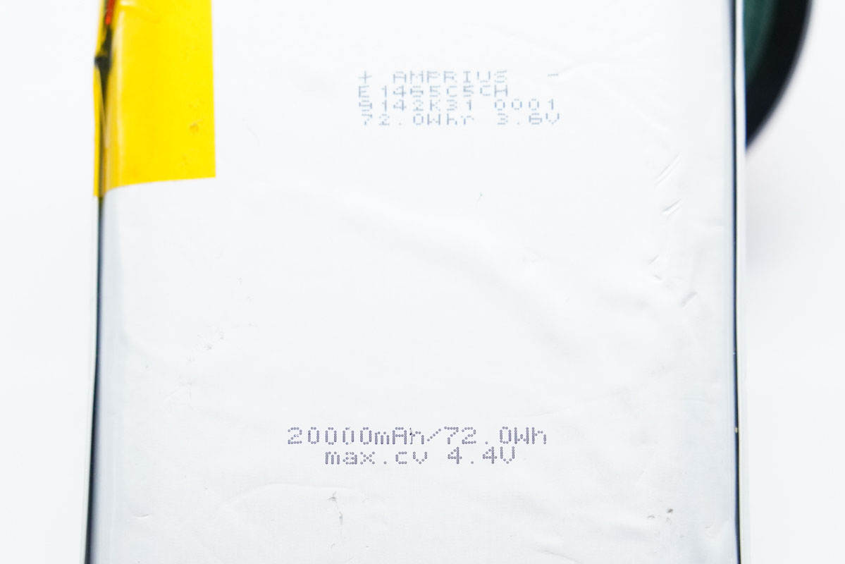 移動(dòng)電源采用Amprius安普瑞斯電芯,規(guī)格為20000mAh/72Wh,充電限制電壓4.4V。