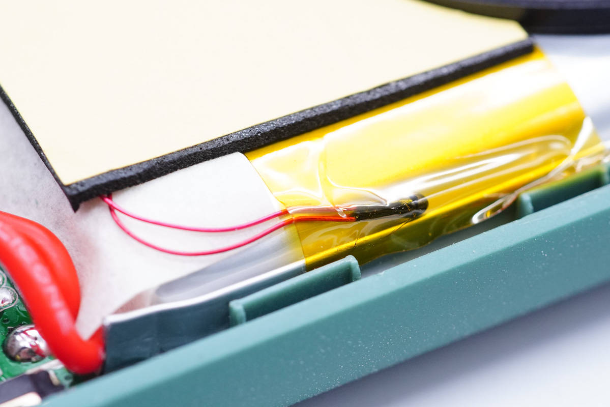 另一半機(jī)身殼上粘貼泡棉對(duì)電芯進(jìn)行固定保護(hù)。