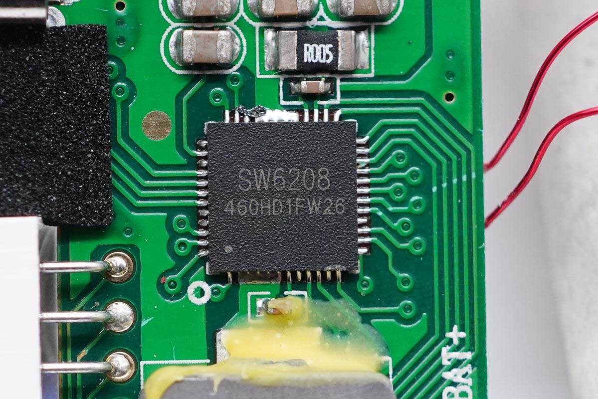 移動(dòng)電源主控芯片采用智融SW6208。這是一款高集成度的多協(xié)議雙向快充移動(dòng)電源專用多合一芯片,支持 A+A+B+C+L口任意口快充。 其集成了5A高效率開(kāi)關(guān)充電,22.5W高效同步升壓輸出,支持PPS、PD、QC、AFC、FCP、SCP、PE、SFCP等多種快充協(xié)議,電量計(jì)量,數(shù)碼管/LED燈顯示以及相應(yīng)的控制管理邏輯。外圍只需少量的器件,即可組成完整的高性能雙向快充移動(dòng)電源解決方案。
