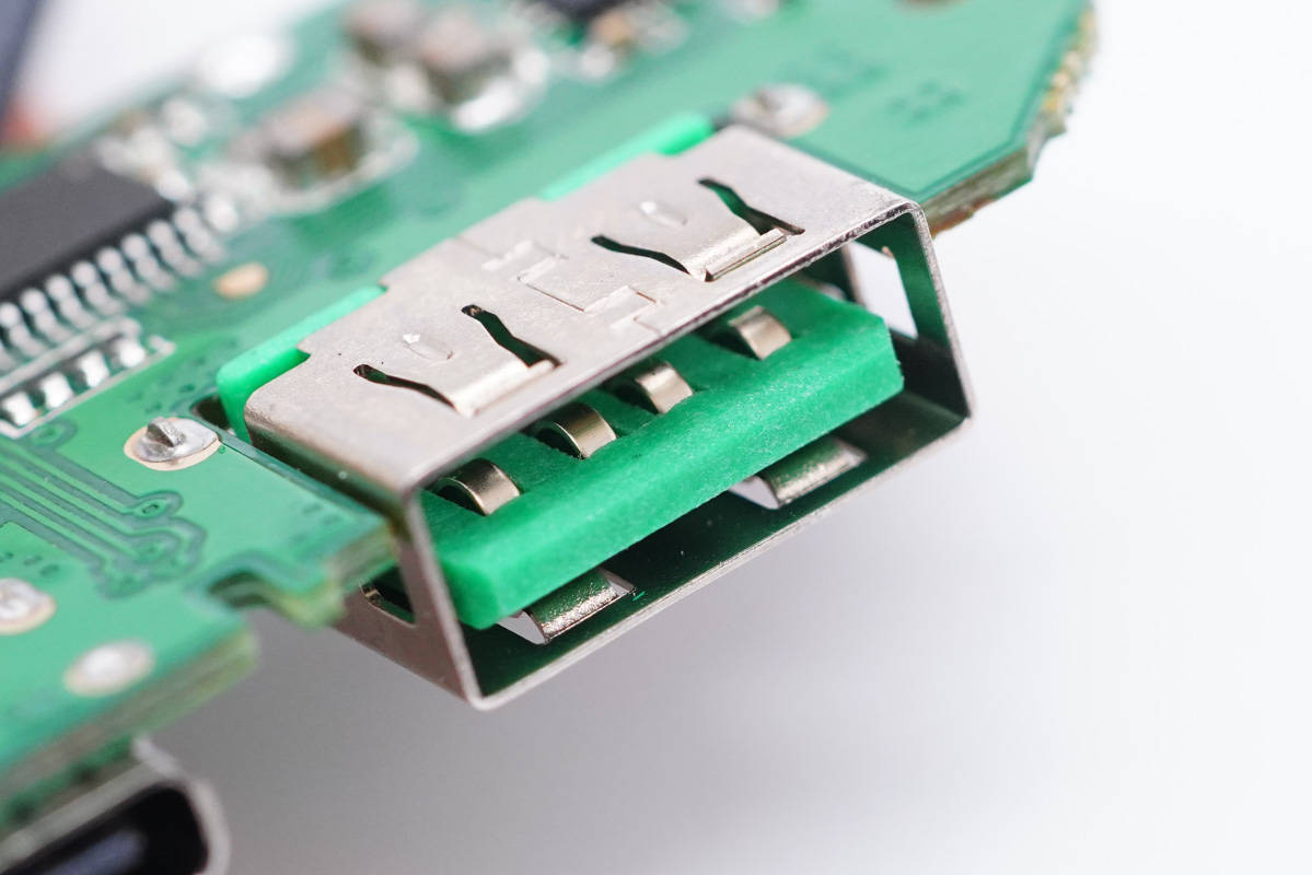 USB-A母座特寫(xiě),沉板過(guò)孔焊接。