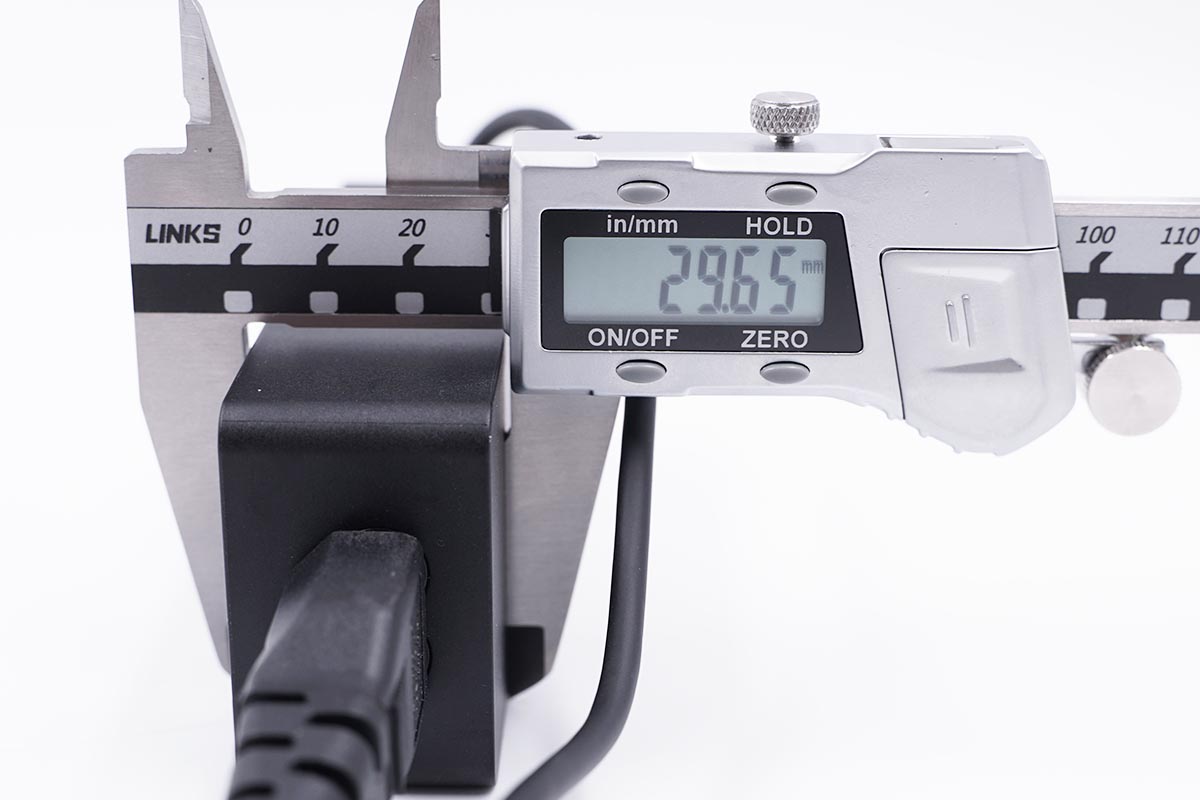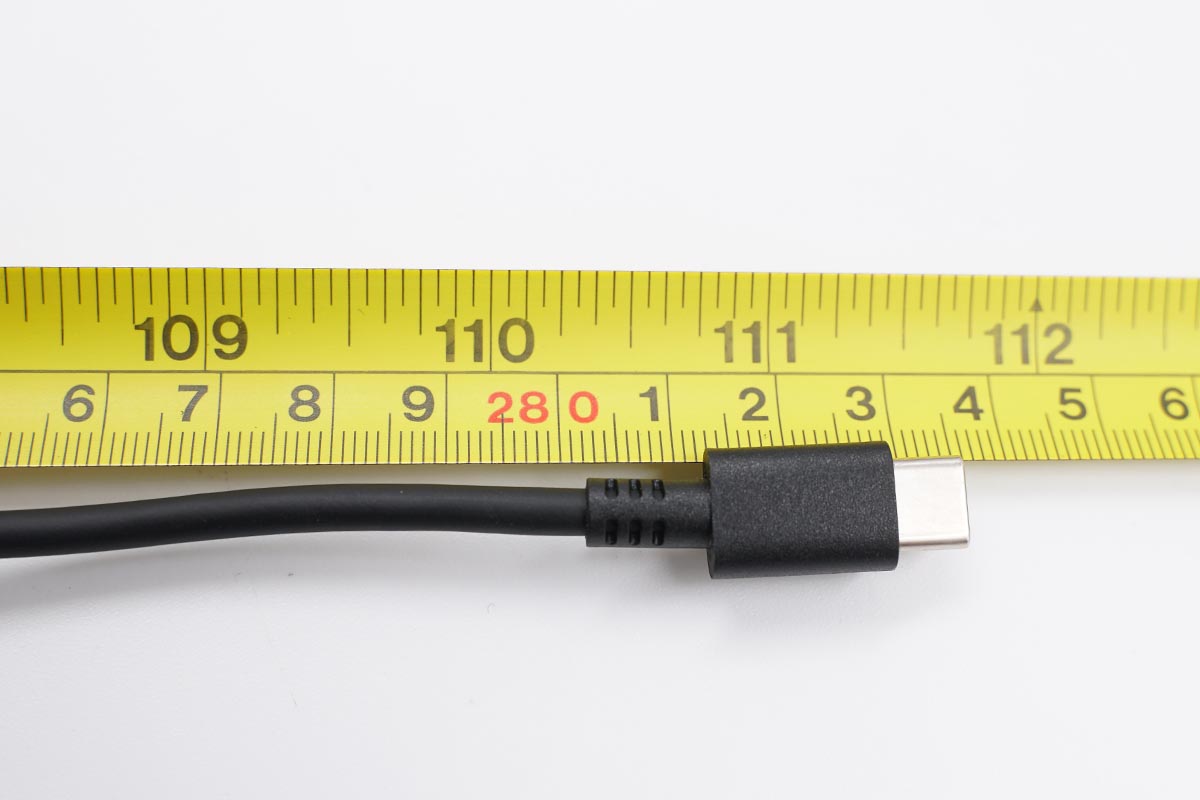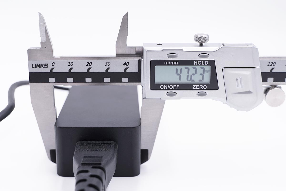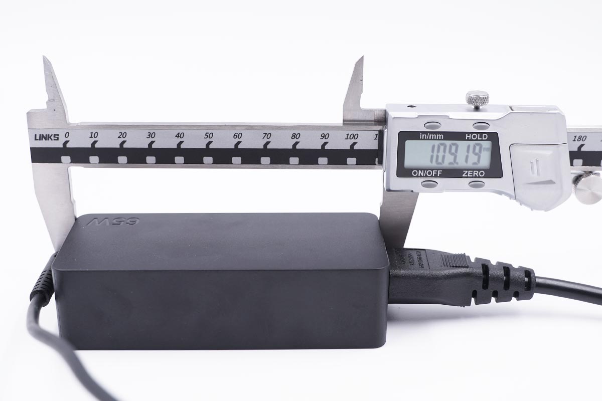使用卡尺實測原裝充電器不算連接線的長度約為109.19mm。