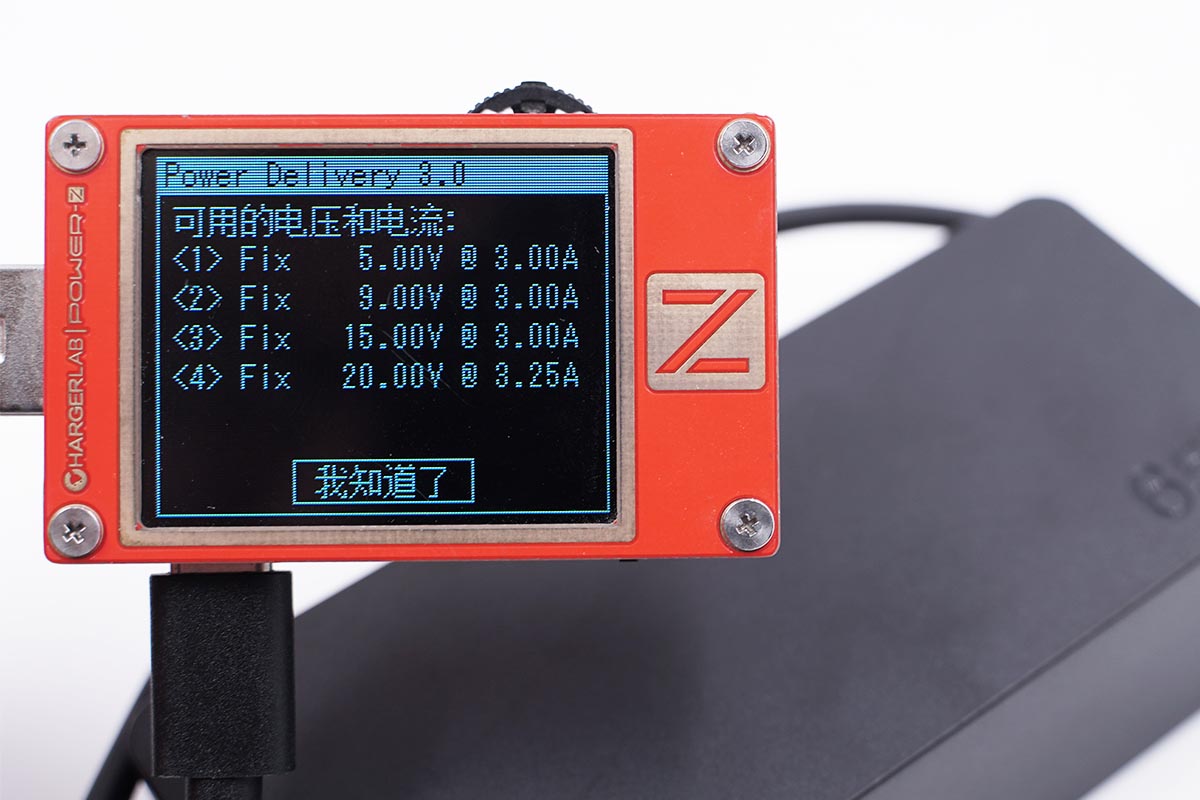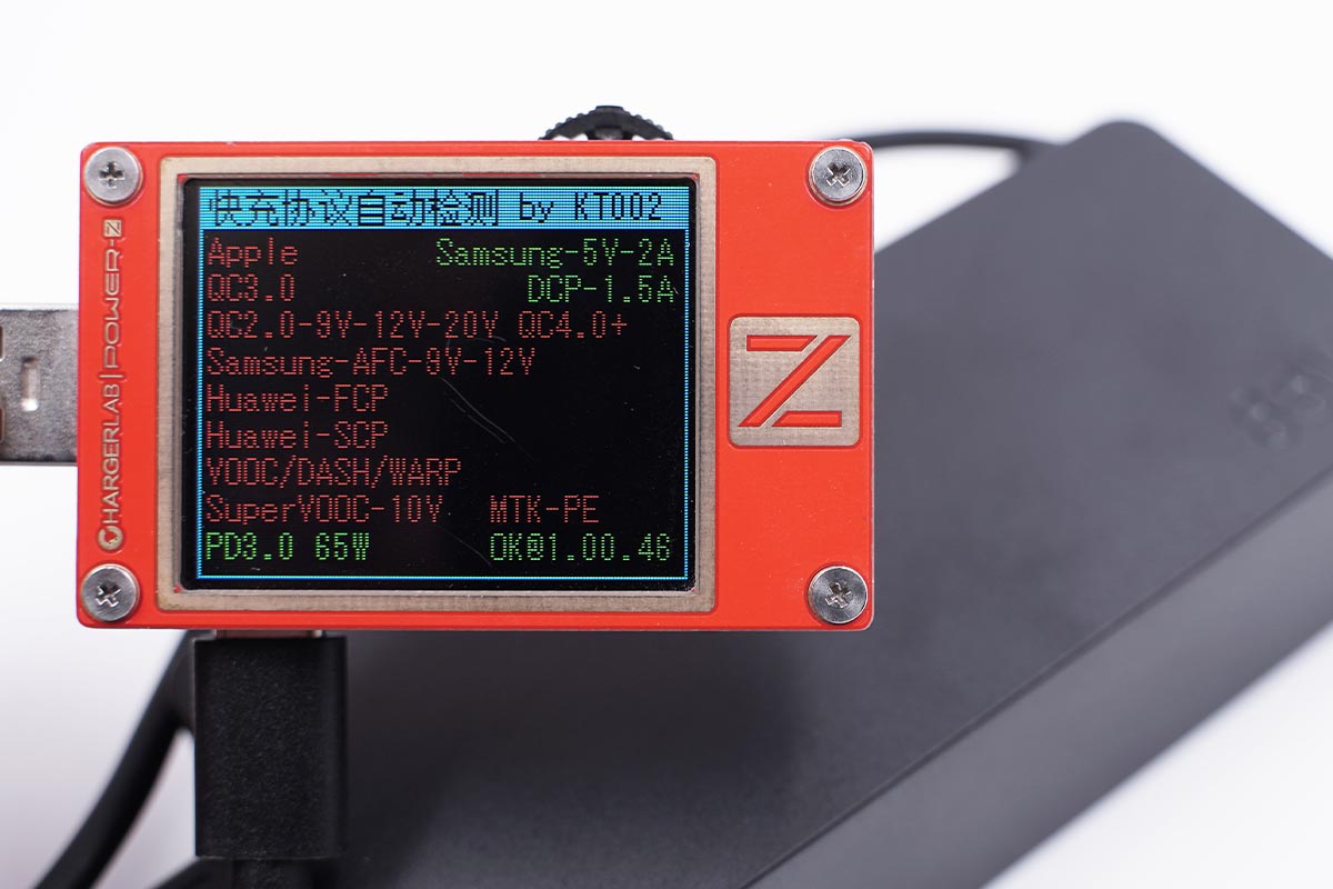 使用POWER-Z KT002讀取充電器的快充協議,實測充電器走的是純PD的通道。