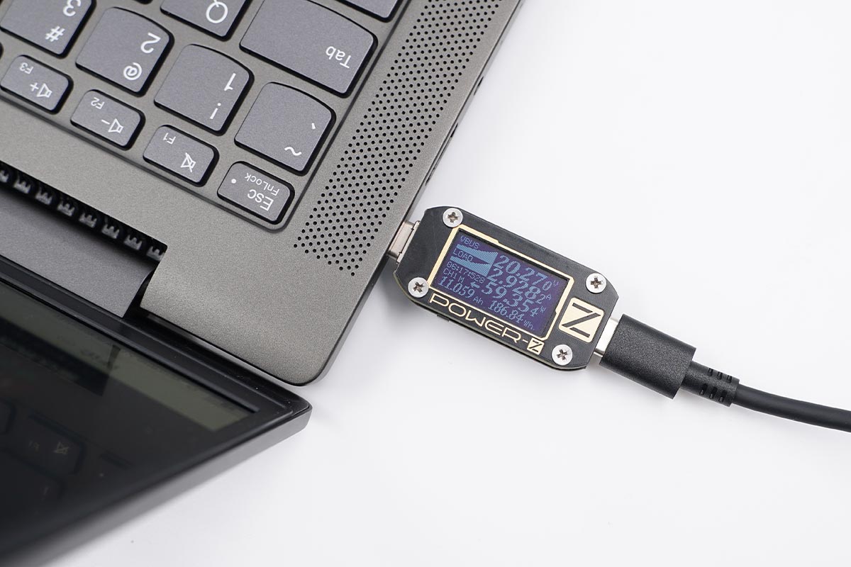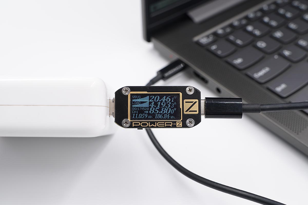 實測使用附帶的原裝65W充電器為筆電充電,功率為20.27V 2.92A 59.35W,成功握手PD快充。