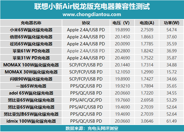 聯想小新Air銳龍版采用了目前通用的USB-C物理充電接口,所以為筆電充電除了原裝的充電器之外只需要使用常規的PD充電器即可。小編挑選了一些目前比較熱門的PD充電器來為筆電充電,實測下來發現雖然標配的是一款65W的充電器,但實際筆電可以接受的充電功率可以達到90W左右,當然這只是最高。小編使用了十幾款PD充電器為聯想小新Air充電,實測下來發現充電功率從15W-90W之間不等,也就是并不是所有的充電器都可以達到較高的充電功率。