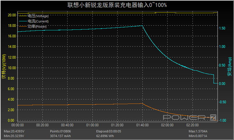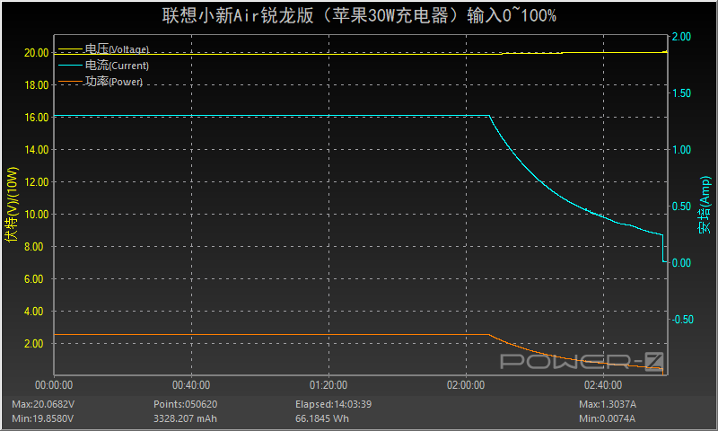 將原裝充電器連接筆電之后開始充電,奇怪的是充電并沒有達到20V3.25A輸入檔位,而且停留在20V1.5A快充檔位,功率在30W左右。1小時40分后功率和電流逐漸下降直至充電結束,全程耗時約2小時37分,最高功率為20.39V 1.57A 32.02W。