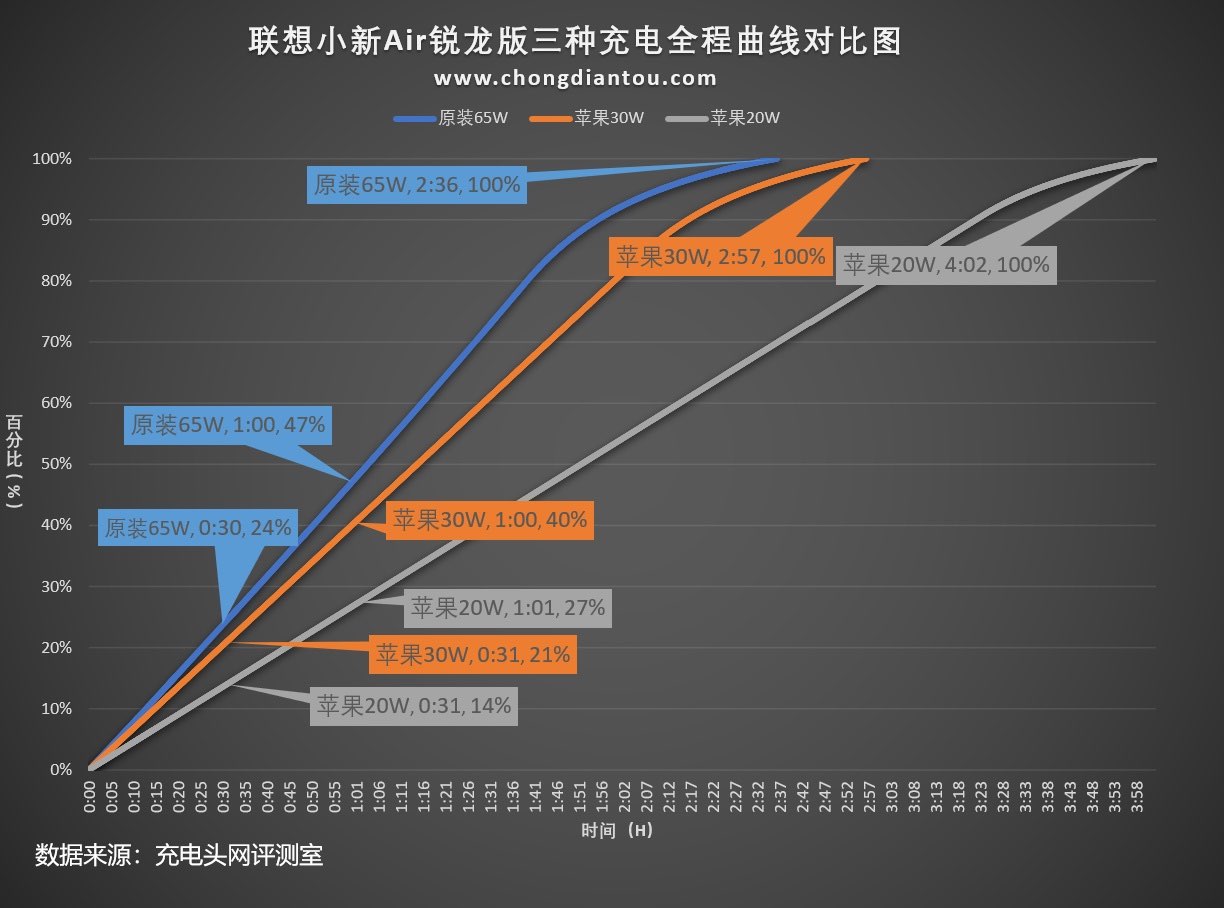 將三種充電全程繪制成曲線圖,可以看出雖然前兩個數據均處于30W功率階段,原裝65W充電器還是要比蘋果30W充電器要快一些的。并且可以看出,蘋果20W充電器是可以正常為筆電充電的,只不過受限于充電器自身功率只有17W左右,而且全程充滿的時間也是最長的,達到了4個小時。