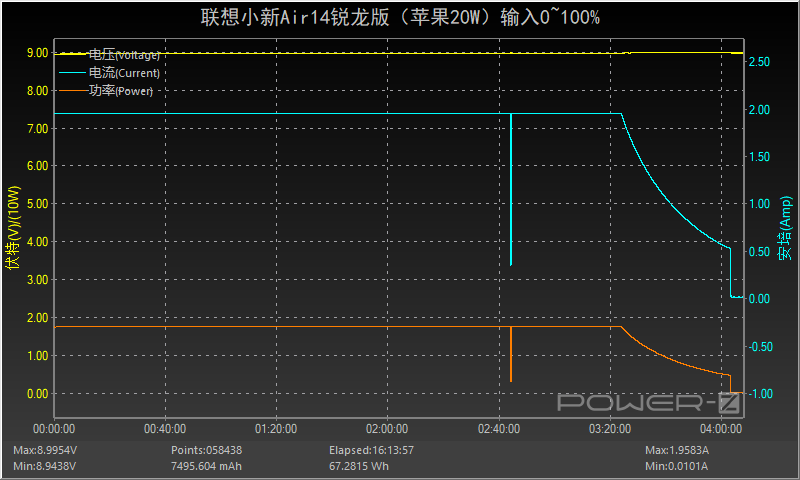 很多讀者對于小功率的充電器能否為筆電充電存有疑問,所以此次小編還找來了蘋果20W PD充電器為筆電充電,3小時24分前功率、電流電壓均處于穩定的輸入狀態,功率在17W左右。隨后功率和電流逐漸下降直至充電結束,全程耗時約4小時03分,最高功率為8.97V 1.95A 17.56W。