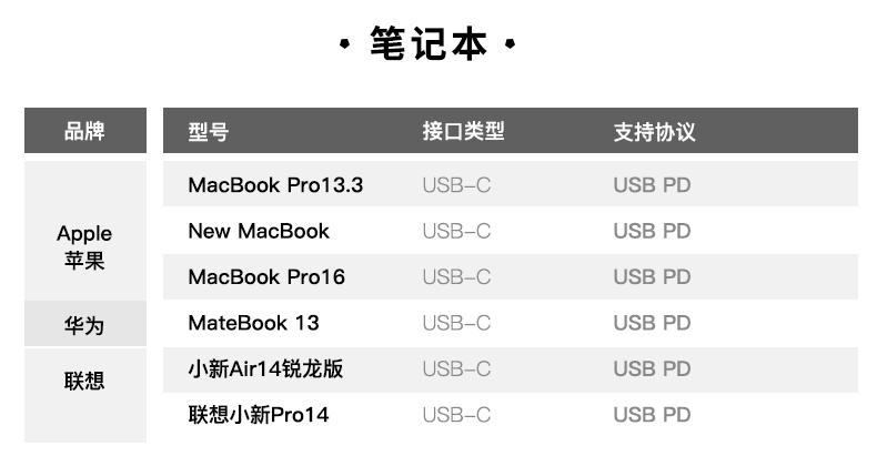 筆電端目前充電頭網評測室共有6臺筆記本電腦,分為蘋果、華為、聯想三個品牌,這些筆電都有一個共同點,均配備USB-C物理充電接口且支持USB PD快速充電,這里面充電功率最高的當初MacBook Pro 16了,支持百瓦快充功率,原裝96W充電器也是蘋果首款百瓦級別的USB PD大功率充電器。