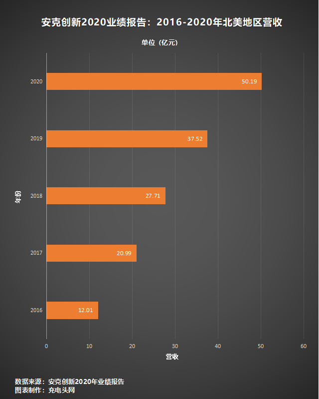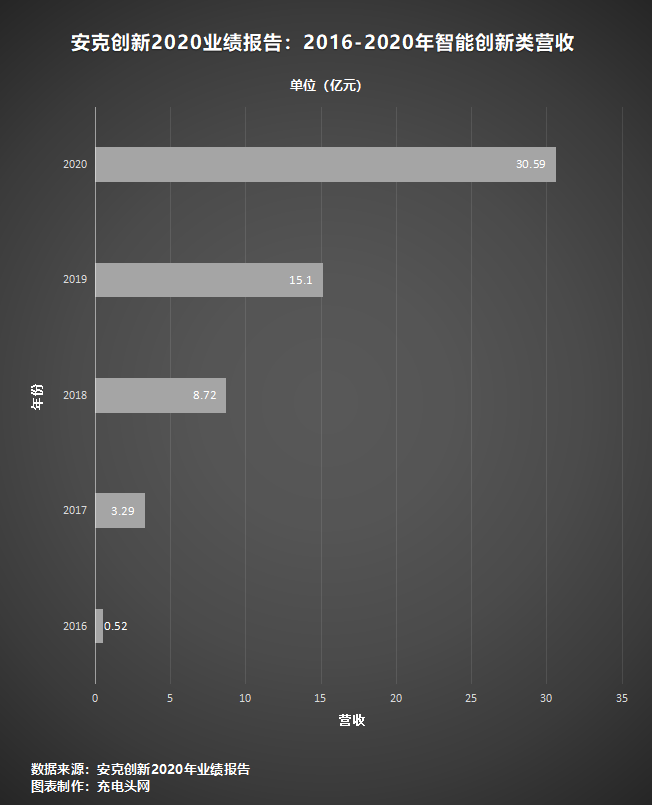 充電頭網(wǎng)統(tǒng)計了安克自2016年到2020年的營收數(shù)據(jù),2016年安克營收為25.05億,到2018年的52.32億元,兩年營收翻倍;再到2020年的93.53億元,兩年營收接近翻倍。