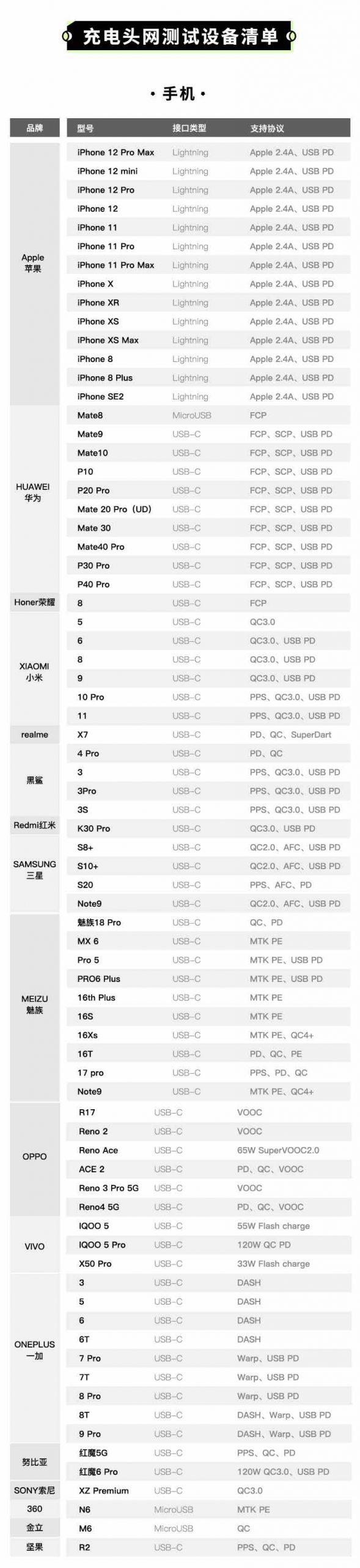 充電頭網評測室目前現有手機75部,品牌包括蘋果、華為、小米、realme、黑鯊、三星、魅族、OPPO、vivo、一加、努比亞等,這些機型涵蓋了USB PD、PPS、Apple2.4A、QC、AFC、FCP、SCP、PE、VOOC、SuperVOOC、DASH、Warp、FlashCharge、SuperDart以及最新的各家120W快充等快充協議,基本已經覆蓋手機端絕大部分的快充協議了,如果想要測試某款移動電源、充電器、車充等產品是否支持以上快充協議,直接實測就可以得出結論了。