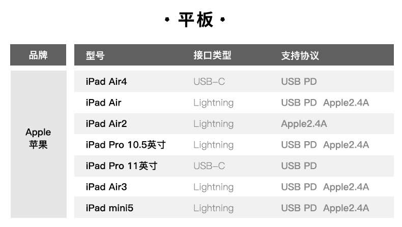 平板這里,目前充電頭網評測室的平板電腦型號以iPad為主,涵蓋了目前蘋果三條iPad產品線,具體包括iPad mini 5、iPad Air第一代到第四代、iPad Pro 10.5英寸到11英寸(全面屏)的機型,充電接口也覆蓋Lightning和USB-C。