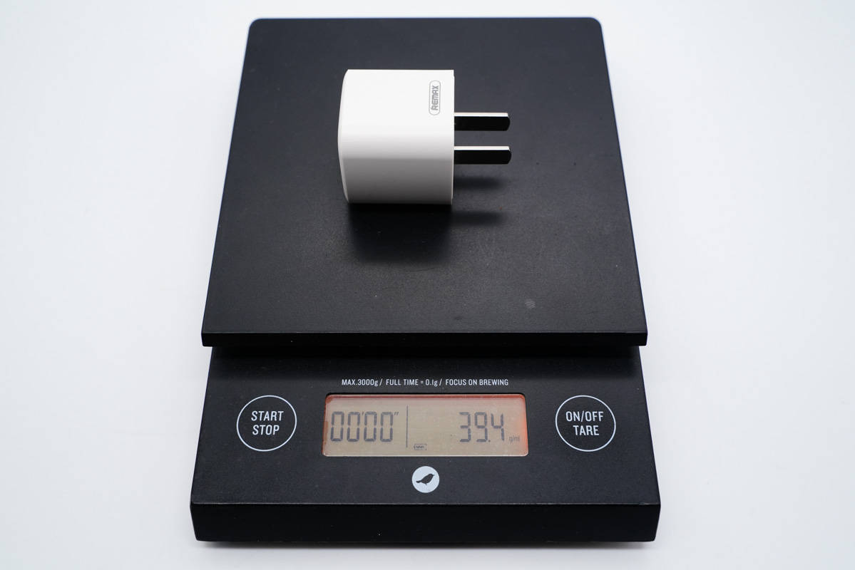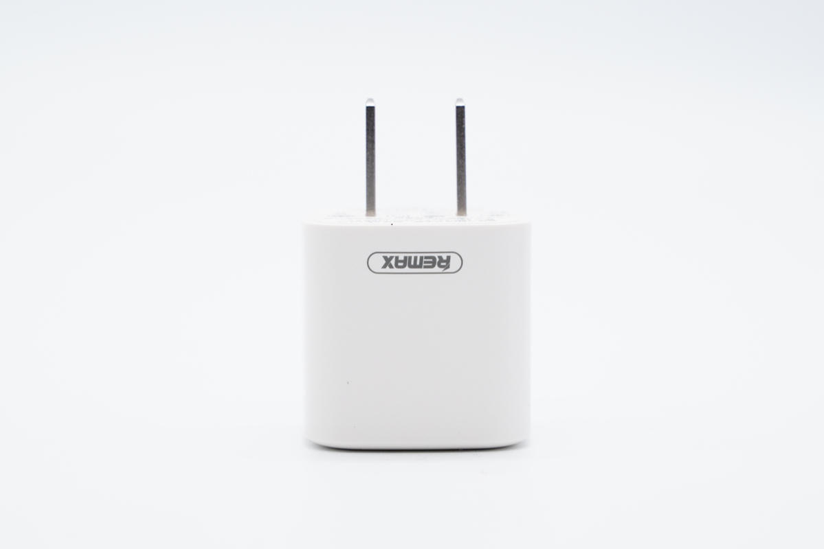 充電器采用小方塊造型設計,PC材質白色外殼表面啞光處理,機身殼上印有REMAX品牌。