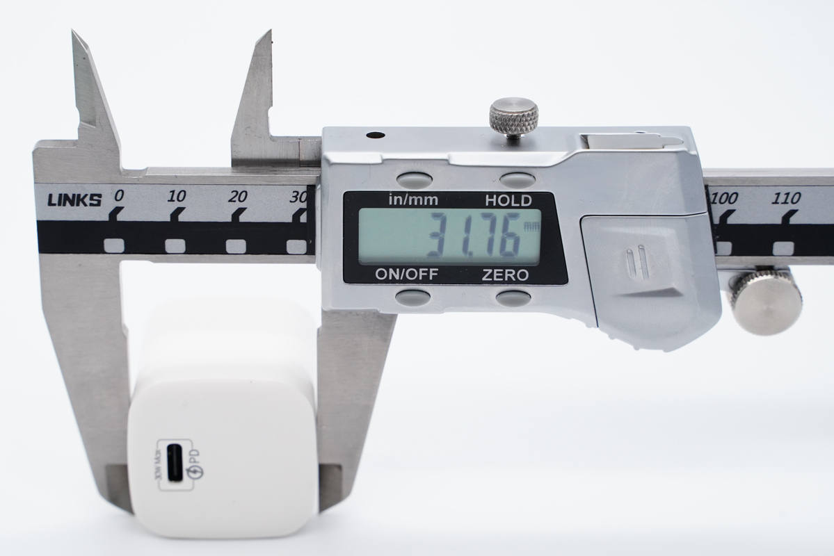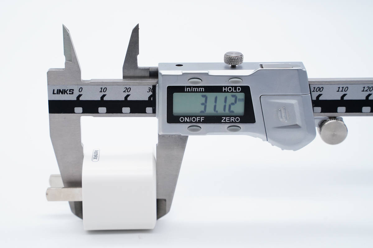 使用游標卡尺實測充電器機身高度為31.12mm。