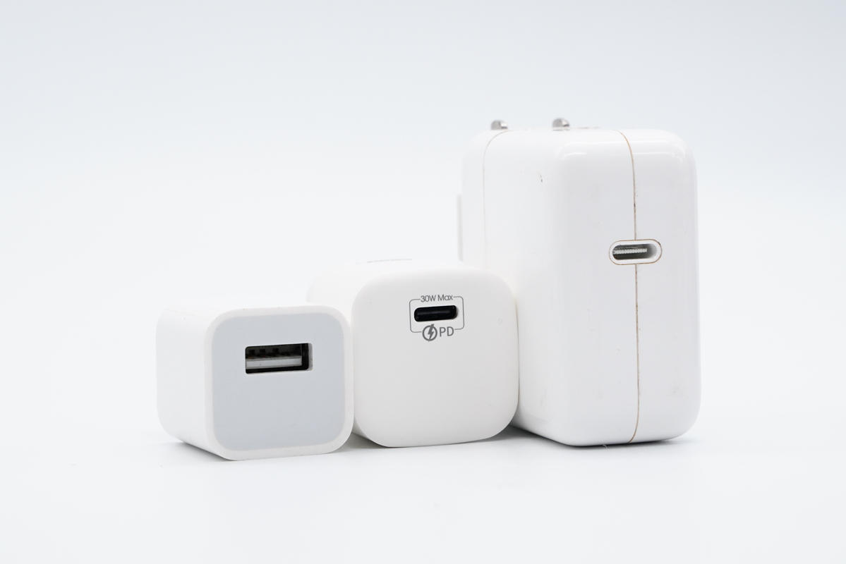 和蘋果5W(左)以及30W(右)充電器直觀對比,REMAX這款30W氮化鎵充電器(中)僅比前者大一點,而比后者要小很多。