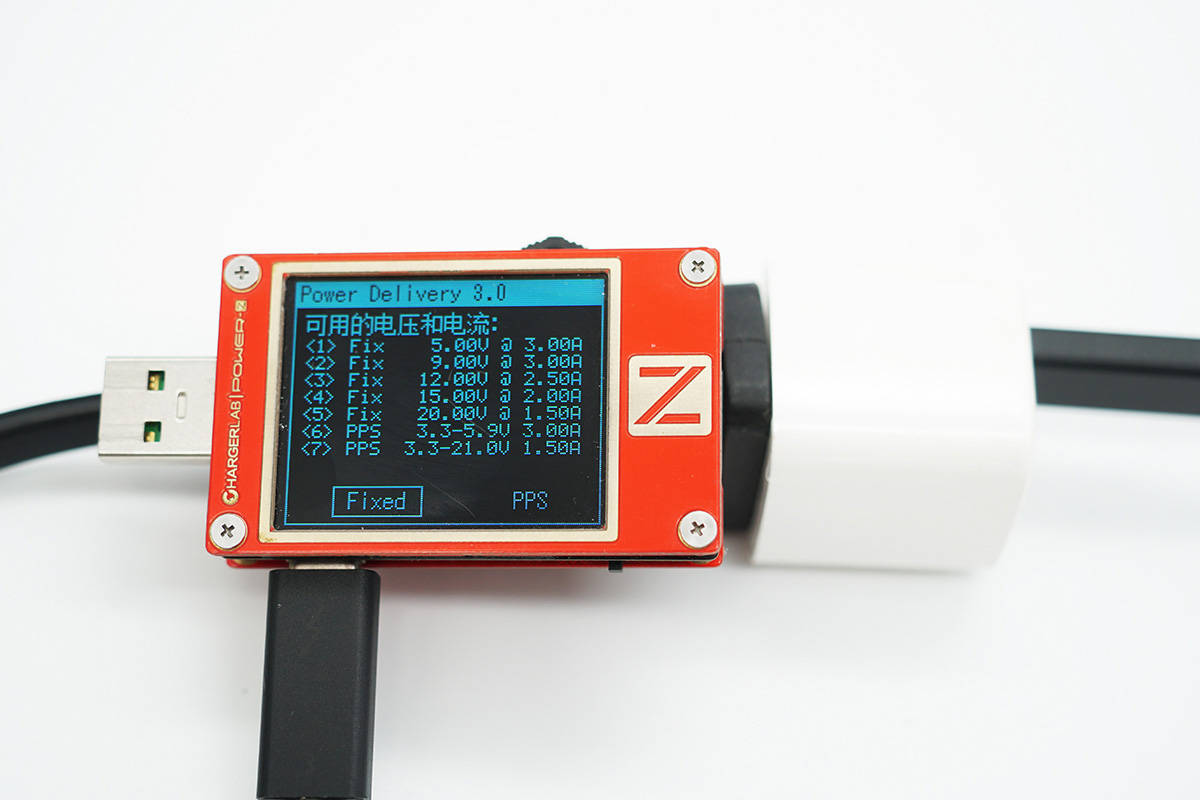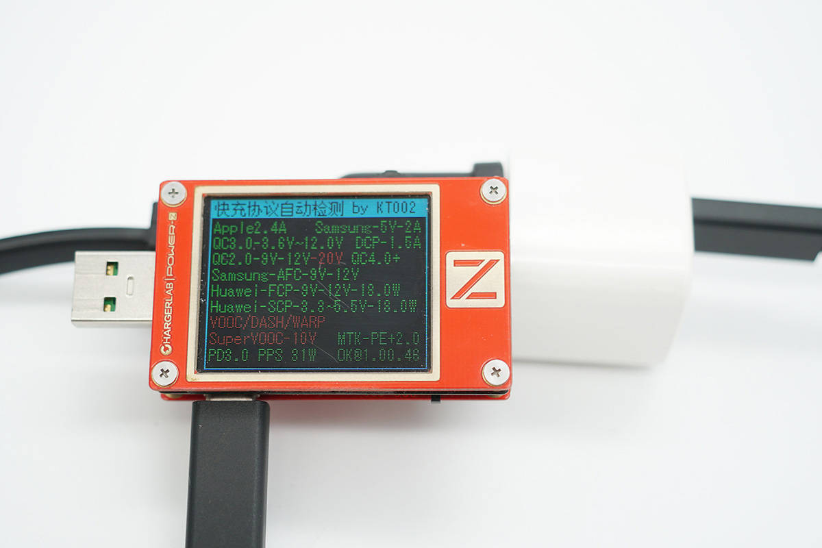 使用ChargerLAB POWER-Z KT002檢測USB-C口輸出協議,顯示支持Apple 2.4A、Samsung 5V2A、DCP協議,以及QC2.0/3.0、AFC、FCP、SCP、PE2.0、PD3.0、PPS快充協議。