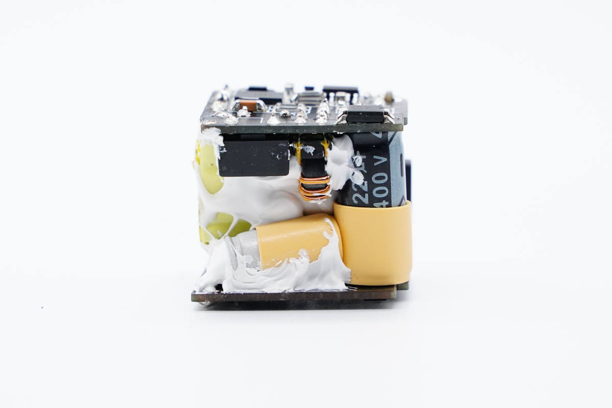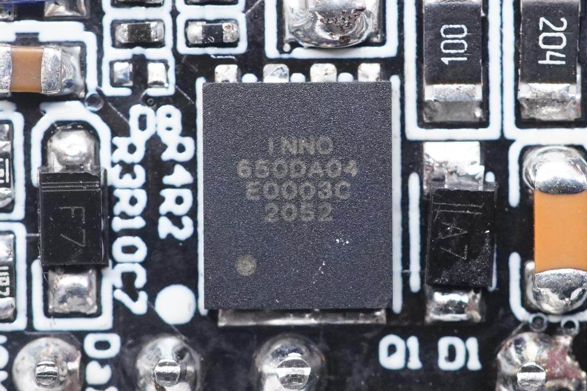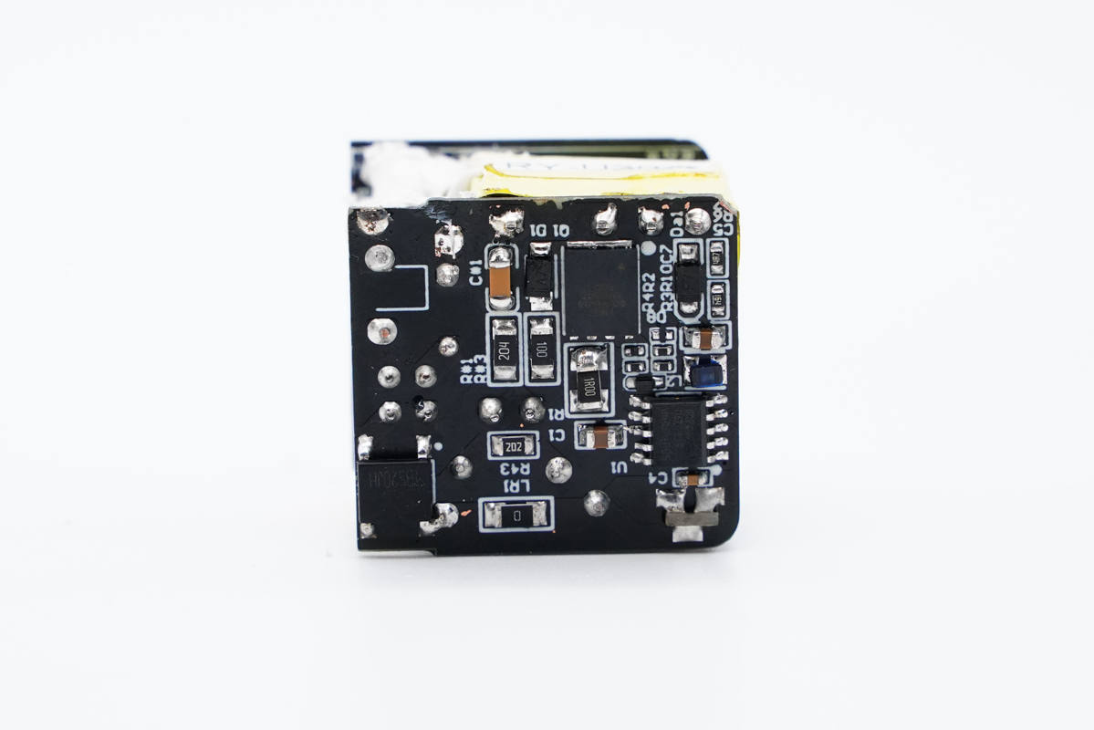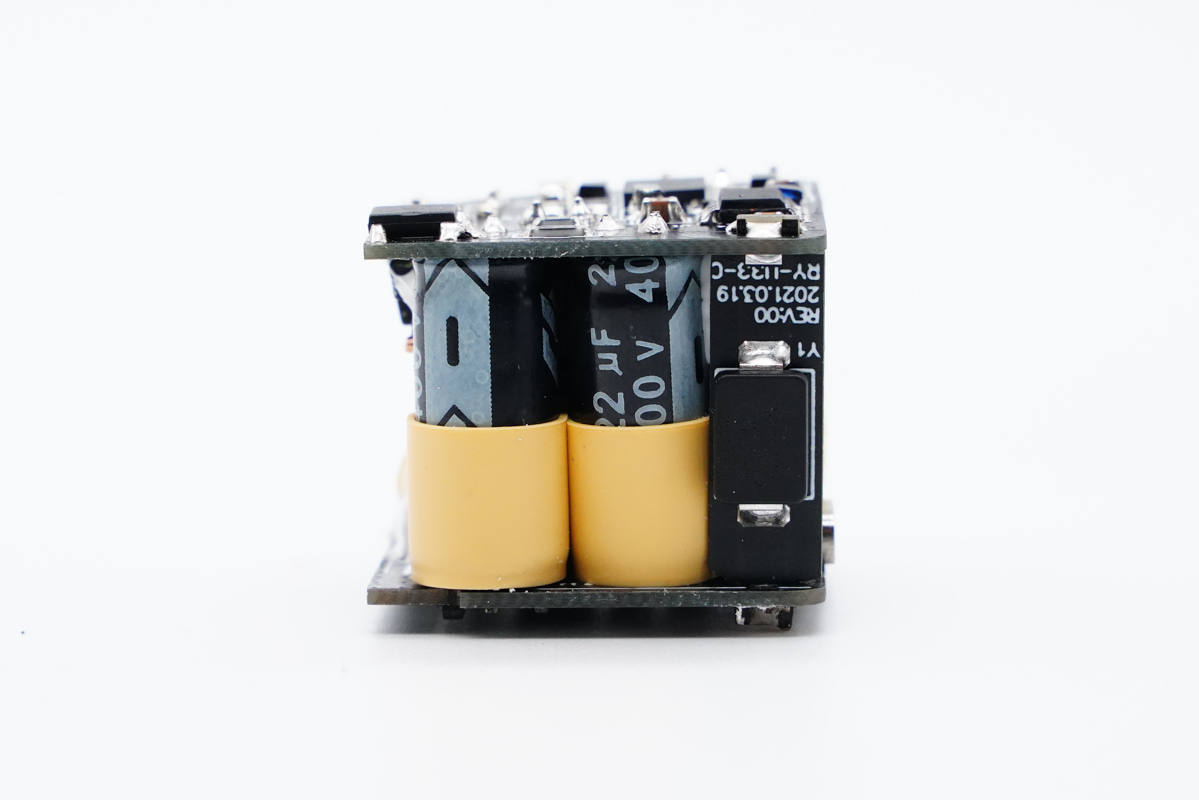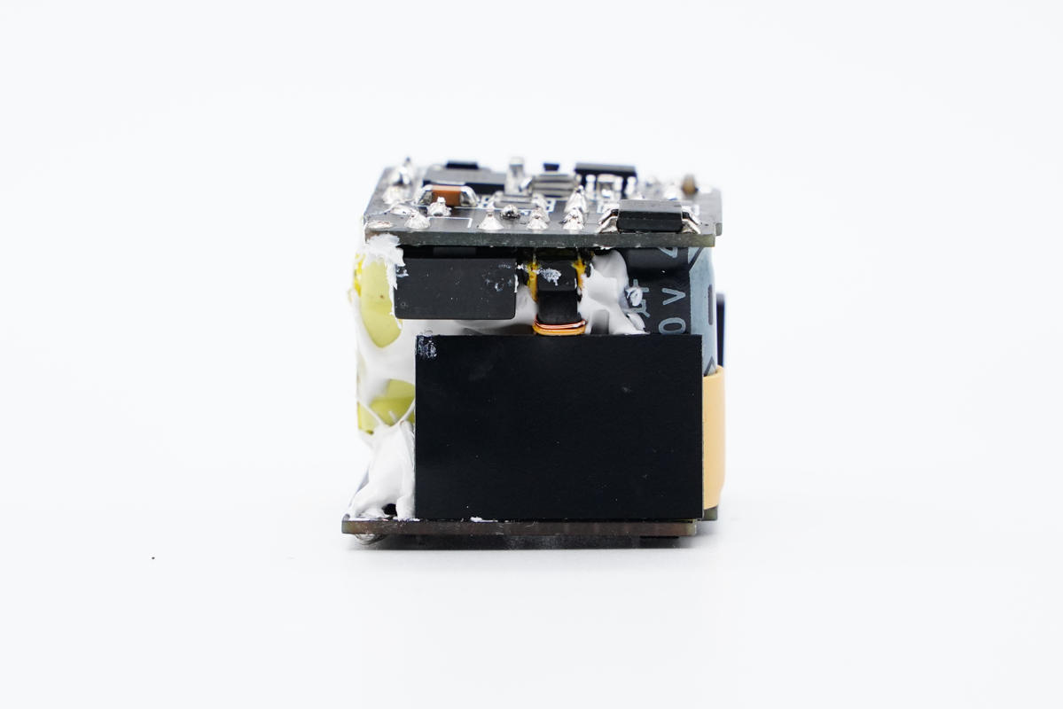 輸入端小板背面可以看到整流橋、PWM主控芯片和氮化鎵功率開關管。