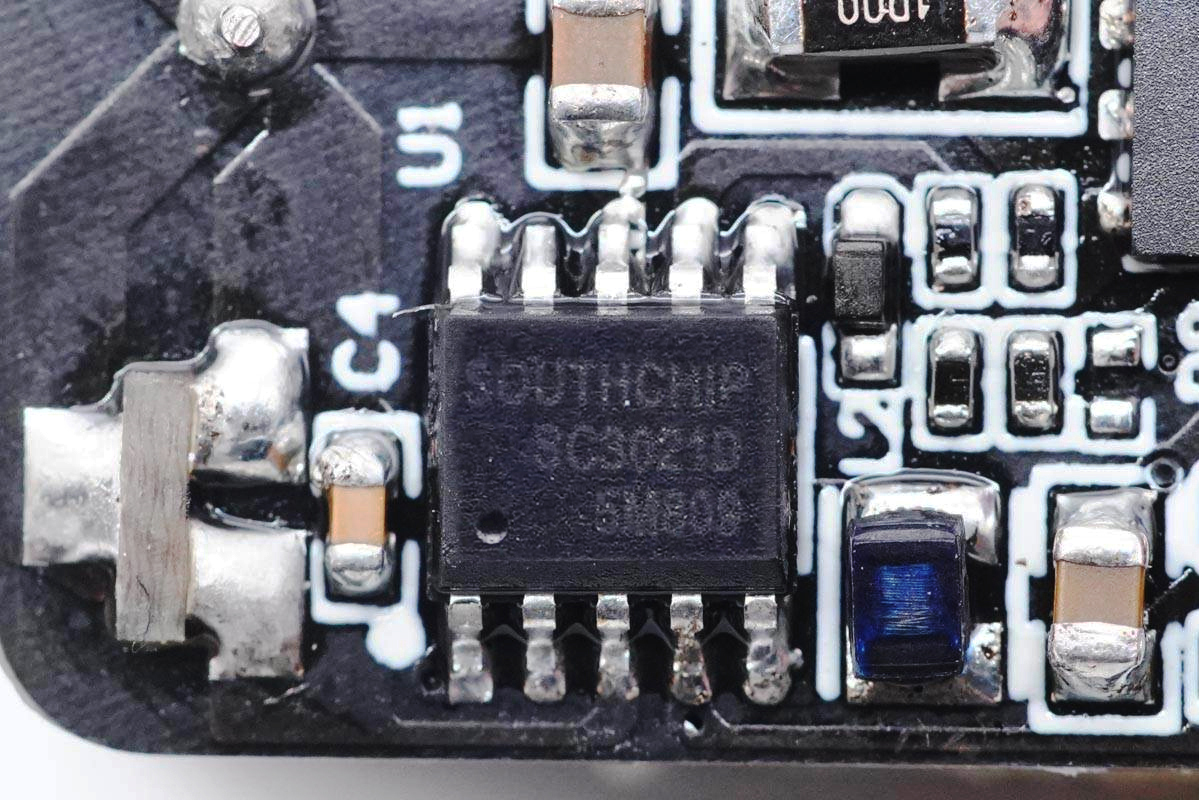 充電頭網拆解了解到,這款充電器基于英諾賽科INN650DA04氮化鎵功率芯片設計,初次級控制器采用南芯SC3021D和杰華特JW7726B,協議芯片采用英集芯IP2726。模塊設有輸入輸出小板以及連接小板,夾層間打膠保證PCBA模塊的穩定性,此外輸入端有絕緣板進行隔離,電容使用膠套隔離保護,細節講究。