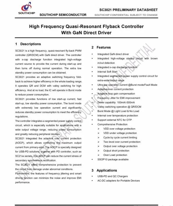 據了解,南芯SC3021x滿足各類高頻QR快充需求,采用專有的GaN直驅設計,省去外置驅動器或者分立驅動器件;集成分段式供電模式,單繞組供電,無需復雜的供電電路;內置高壓啟動及交流輸入Brown In/Out功能,集成了X-cap放電功能。