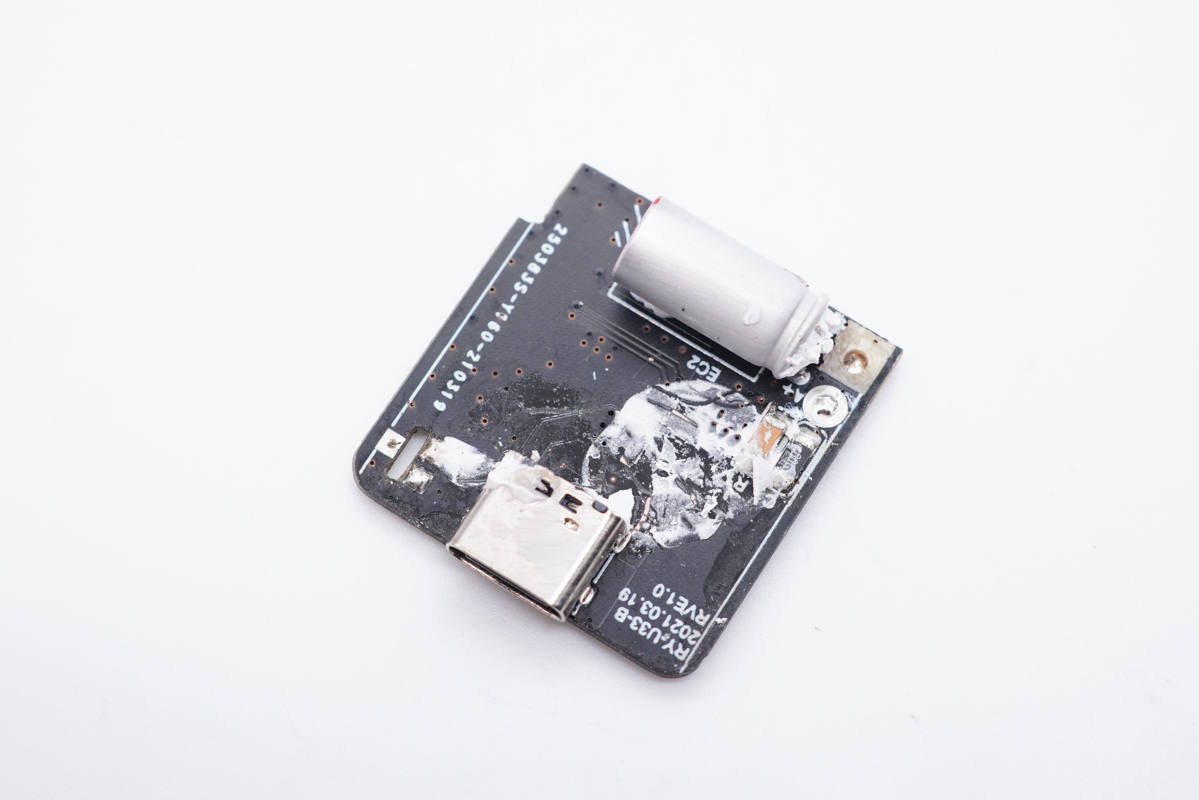 充電器設有輸入輸出兩塊小板,之間通過一塊很小的板子進行連接。各器件的空隙里打膠處理,PCBA模塊整體穩定性得以保證。