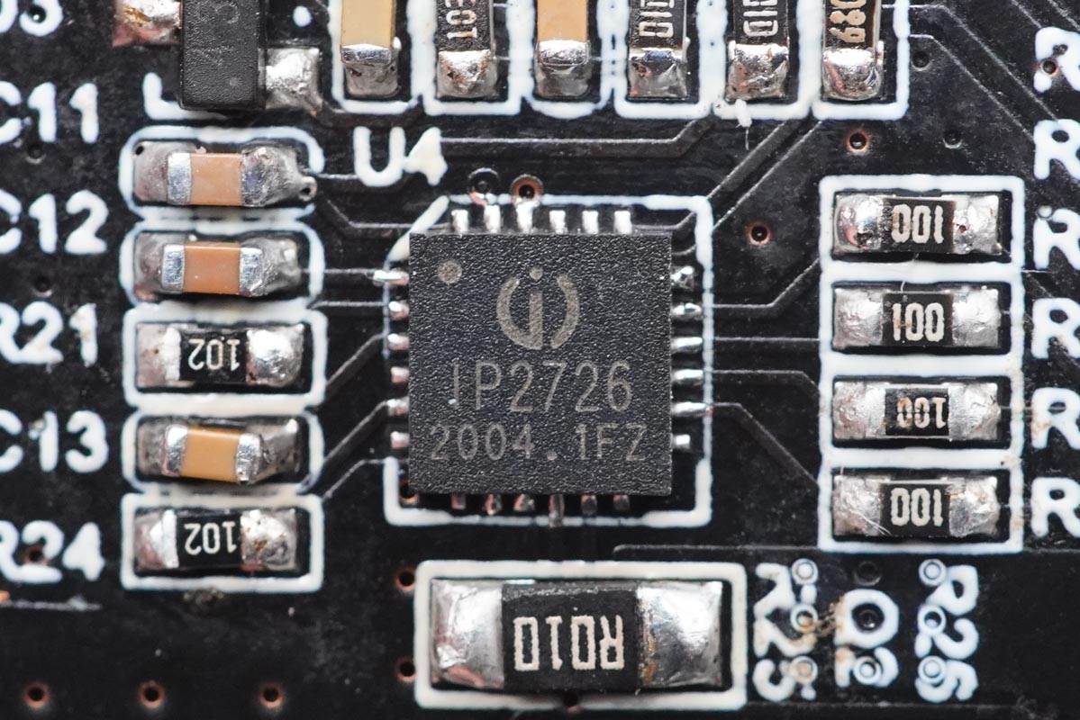 協議芯片采用英集芯IP2726,這是一顆集成多種協議、用于USB輸出端口的快充IC,支持Type-C DFP、PD2.0/3.0、PPS、QC4+、QC2.0/3.0、FCP、AFC、SCP、MTK PE+、Apple2.4A、BC1.2以及三星2A等協議。具有高集成度和豐富的功能,在應用時僅需極少的外圍器件,有效減小整體方案的尺寸,降低BOM成本。